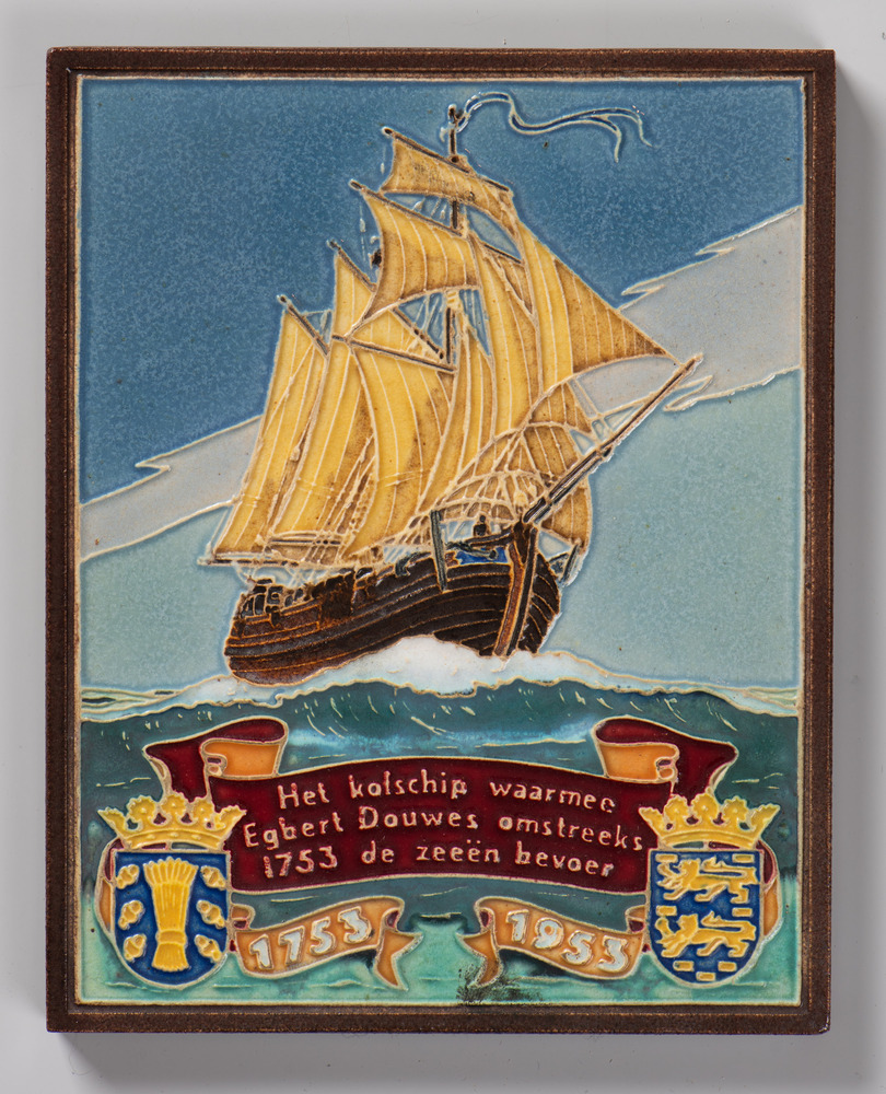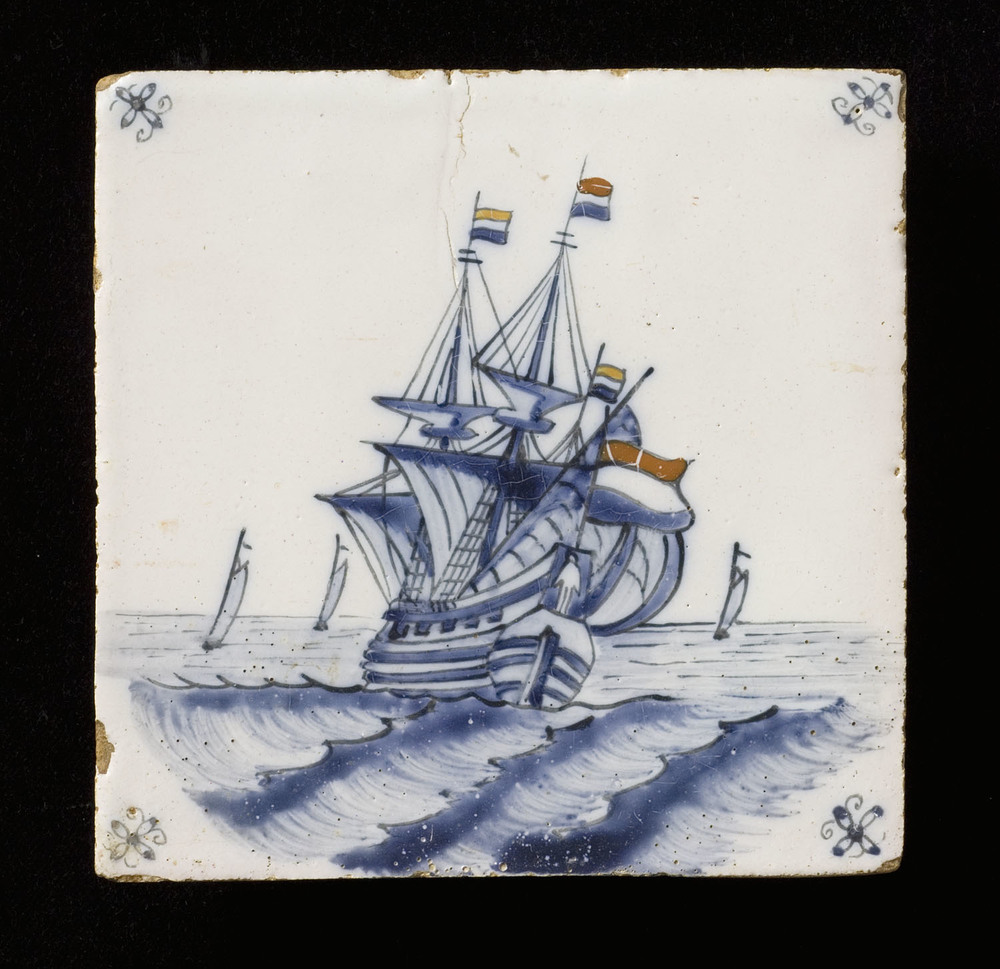 Tegel in tinglazuur, voorstellende scheepvaarttafere...