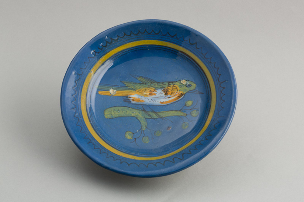 Majolica bord, met voorstelling: vogel op een blauwe...