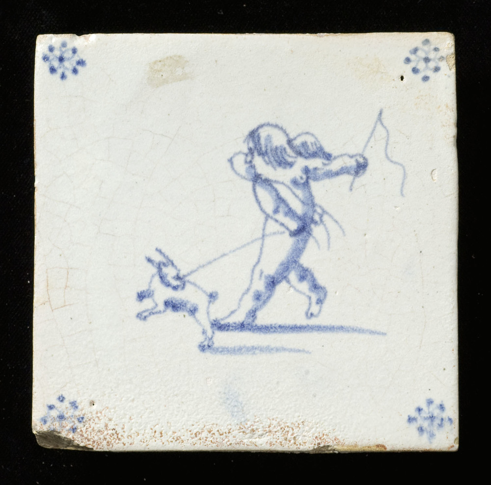 Tegel in tinglazuur, voorstellende cupido met zweepj...