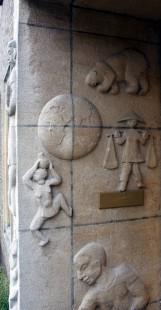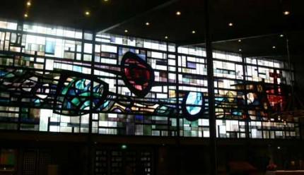 Speciaal geselecteerd werden afgekeurde, gesinterde en kromgetrokken bakstenen. Gesmolten glasverkleuringen zijn toegepast in ovenvlammen, zon en de graanmolen (1)