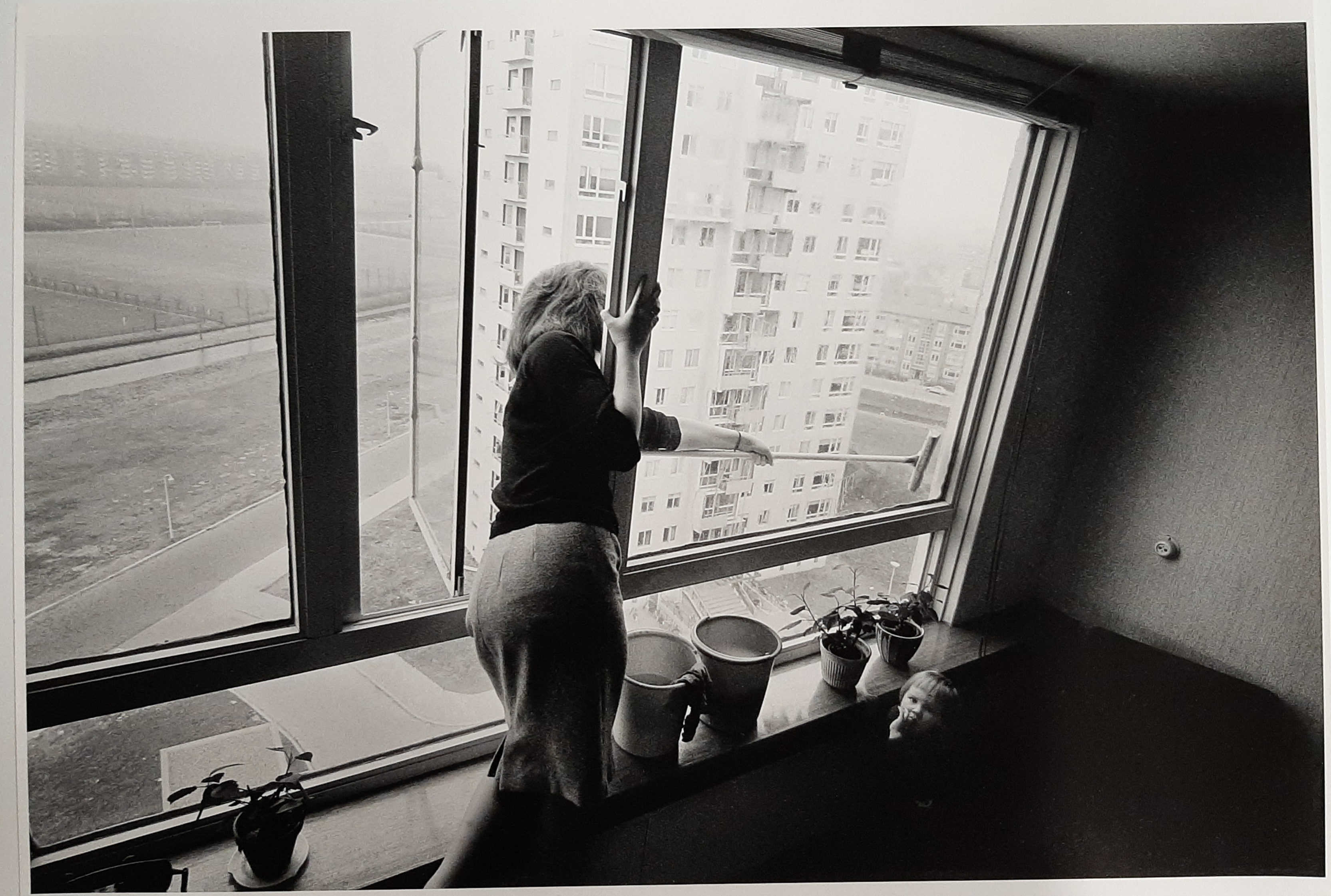 Man aan het werk in een dakkapel met uitzicht op de ...