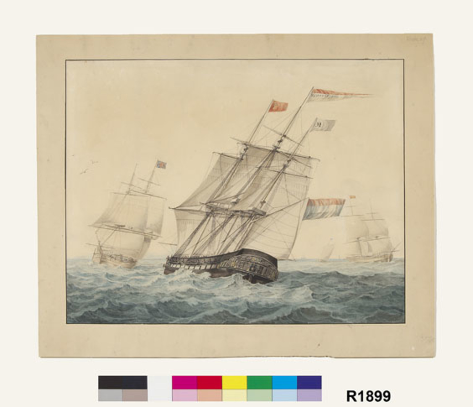 Schip met collegevlag, het barkschip Vrouwe Johanna ...