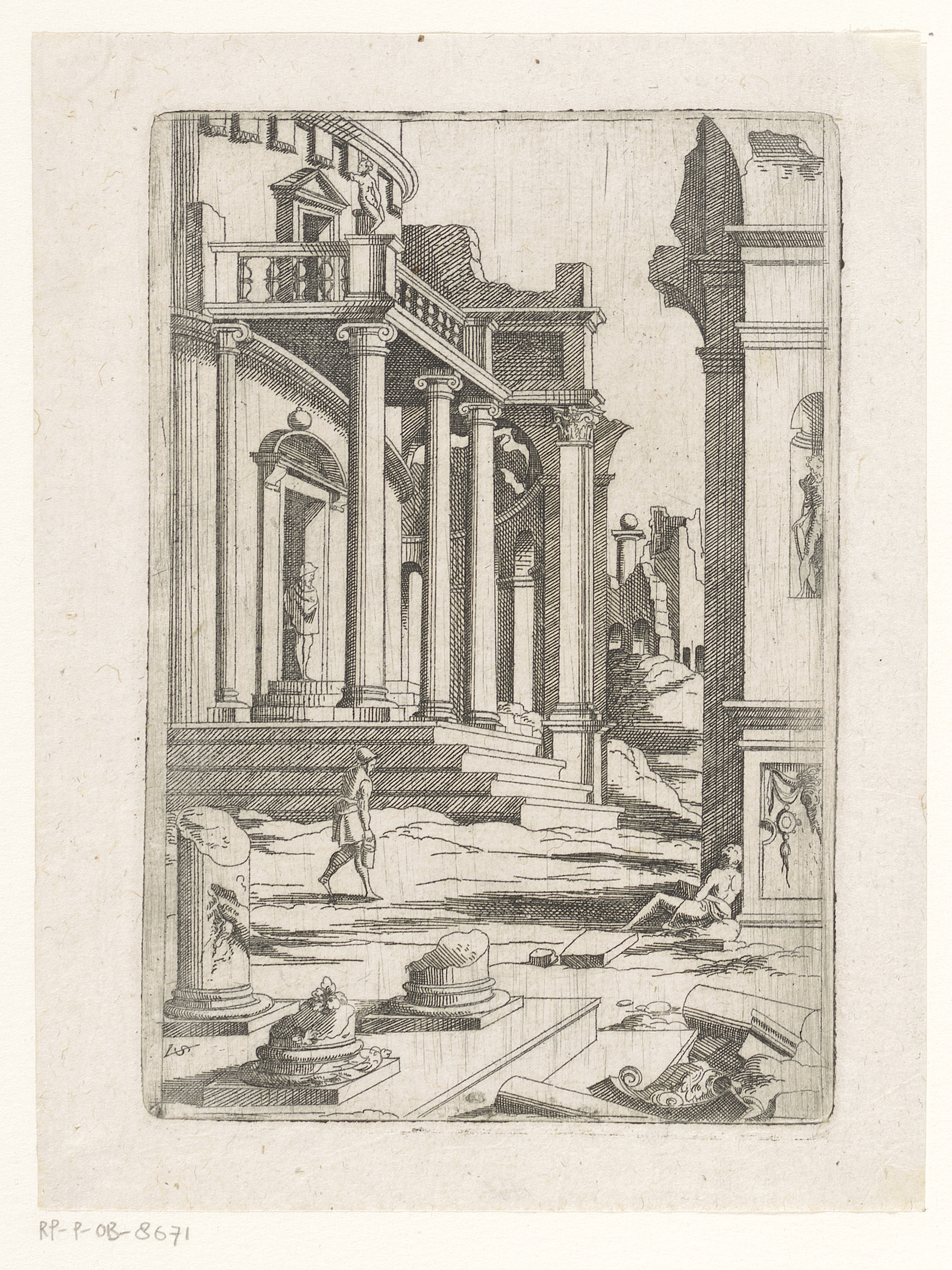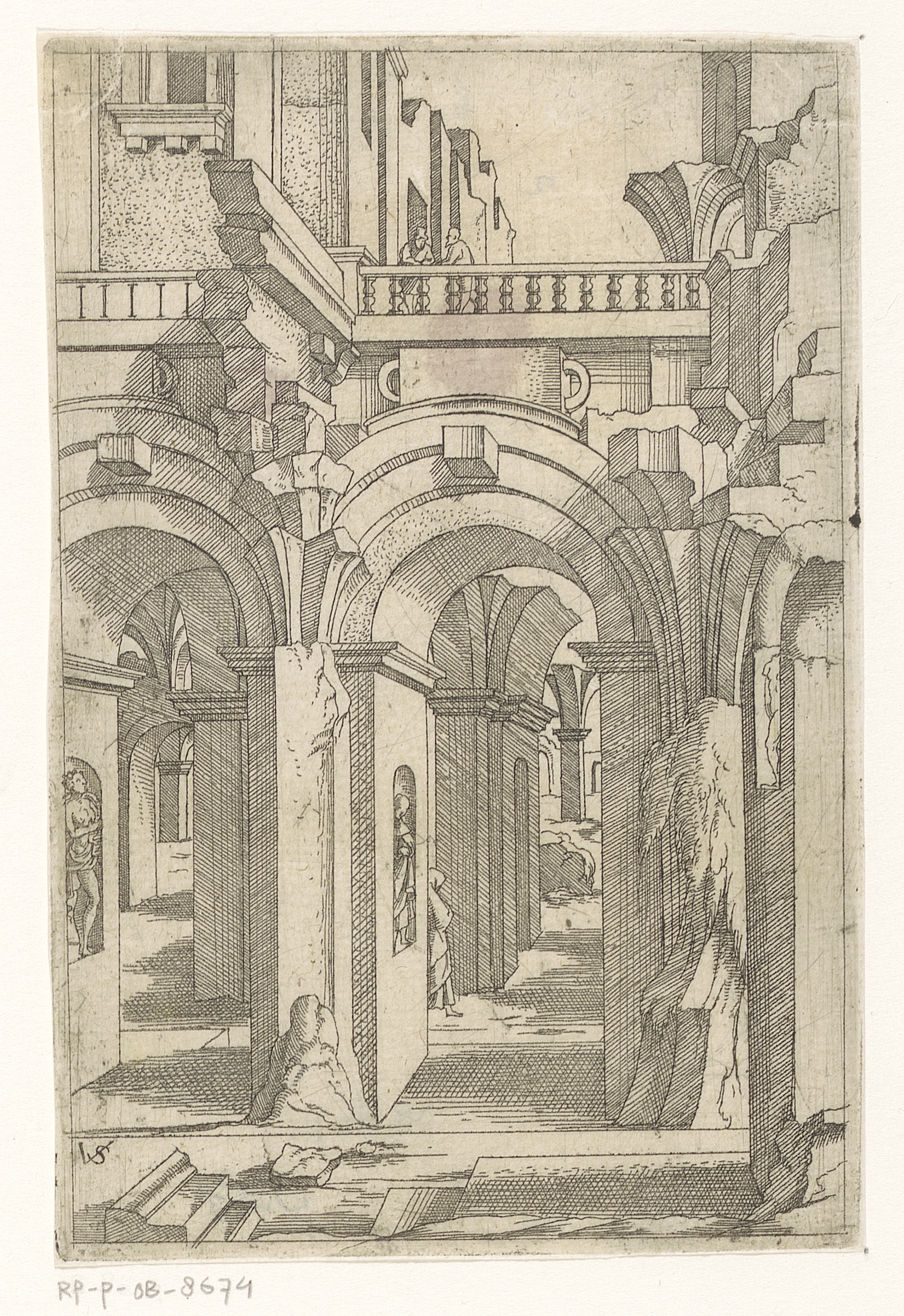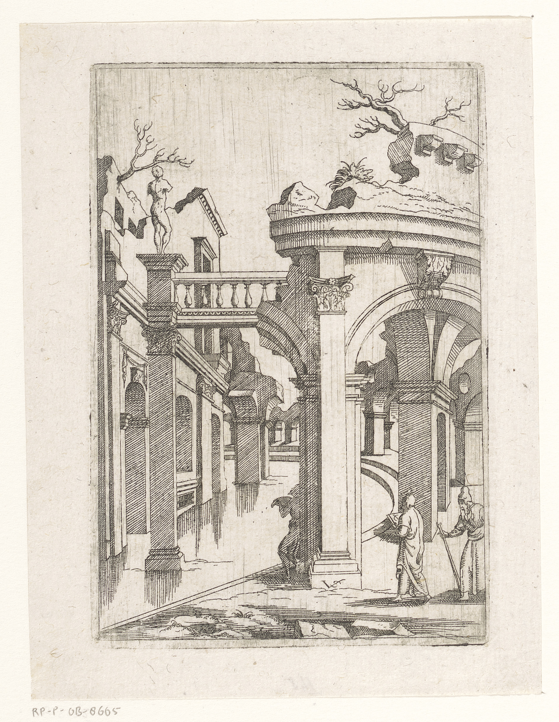 Ruïnes met twee figuren leunend over een balustrade