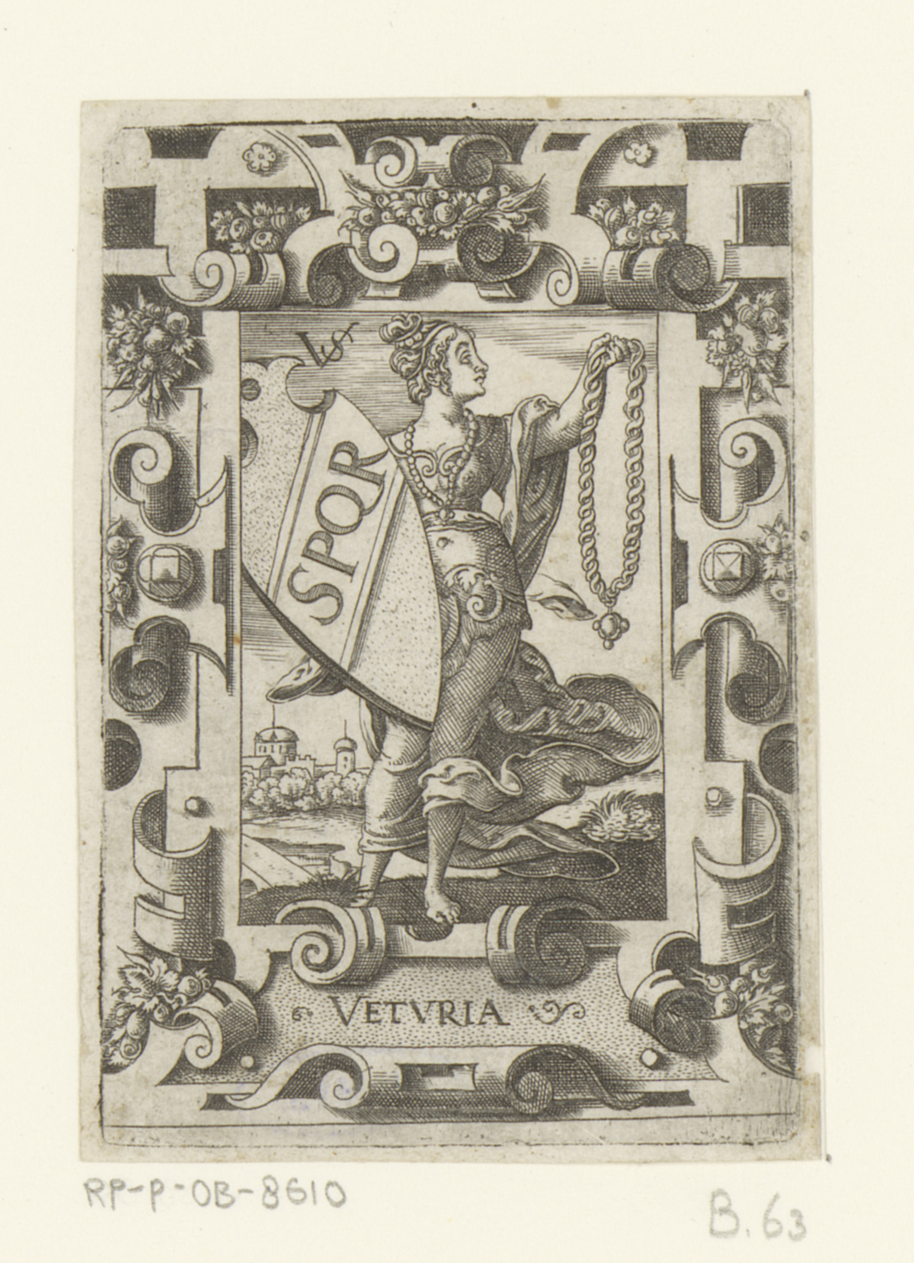 Veturia met wapenschild in rolwerk omlijsting