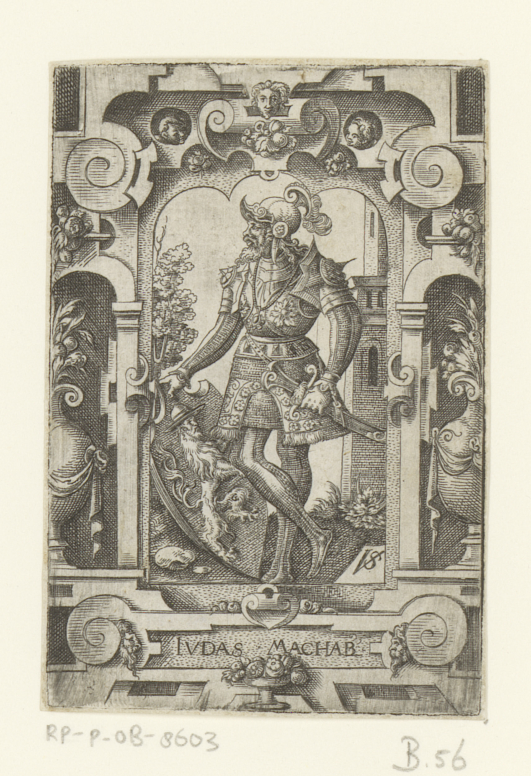 Judas de Makkabeër met wapenschild in rolwerk omlijs...