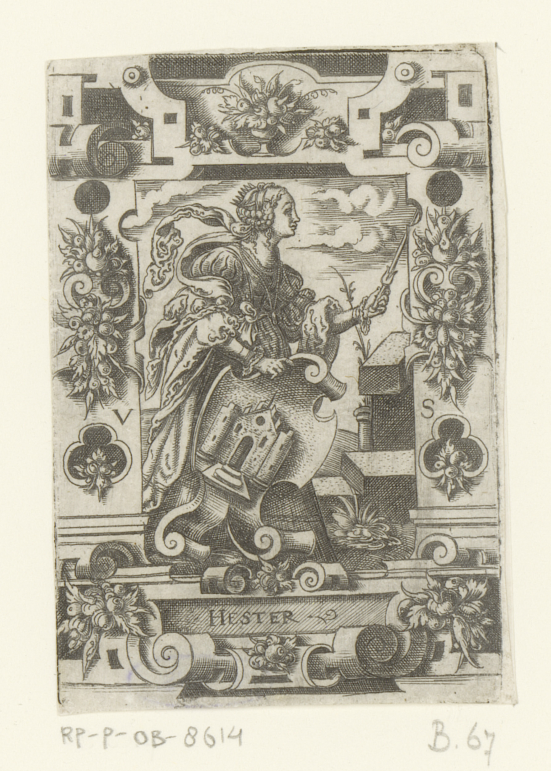 Esther met wapenschild in rolwerk omlijsting