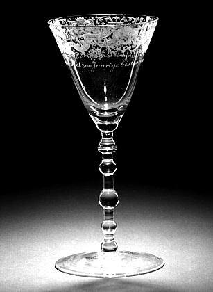 Helder kleurloos glas. Conische voet. Basisknoop. Stam met vier knopen. Conische kelk. Rondom bovenzijde kelk loof- en bandwerk. Hieronder het opschrift: Het 300 Jaarige bestaan van het burger Weeshuis den 6 April A 1820/.