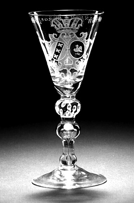 Helder kleurloos glas. Conische voet. Basisknoop. Balusterstam met langgerekte luchtbel en knoop met dubbele rij luchtbellen. Conische kelk. Op kelk een gekroond dubbel cartouche waarin respectievelijk het stadswapen van Amsterdam en een duif, het symbool van het Burgerweeshuis. Aan weerszijden cartouches een weesmeisje en -jongen. Onder mondrand het opschrift: HET WELWEESEN VAN 'T BURGER WEES ...