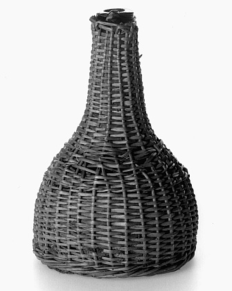 Groen glas. Ingestoken bodem. Bolvormig lichaam, overgaand in smalle hals. Fles gevat in gevlochten pitriet.