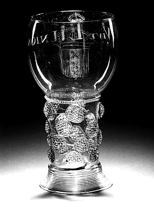 Helder groen glas. Concaaf-conische voet van gesponnen glasdraad. Ingestoken bodem. Cilindrische schacht met vier rijen braamnoppen, aan één stuk geblazen met bolvormige kelk. Geribde glasdraad op overgang schacht en kelk. Op kelk het gekroonde stadswapen van Amsterdam, op andere zijde het opschrift: VIVE L' UNION/ (Leve de eendracht).