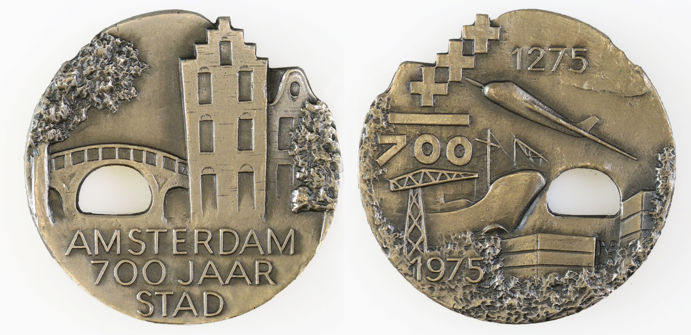 voorzijde: een blik op oud-Amsterdam, zoals dit in de wereld bekend is: een grachtengezicht met brug en twee oude gevels en twee bomen. keerzijde: een symbolische visie op modern Amsterdam met flatgebouwen, vliegtuig en hijskraam. De ruimte onder de brug op de voorzijde is ajour en staat in verbinding met de keerzijde, waarmee wordt aangeduid ...