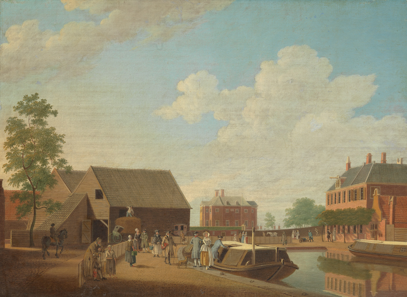 Een aantal reizigers staat op het punt in een trekschuit te stappen die aan een brede, bestrate weg ligt gemeerd. Links op de achtergrond enkele grote schuren, rechts en in de verte enkele statige gebouwen. Blauwe lucht met wolkvorming. Nauwkeurige, enigszins starre schilderwijze.