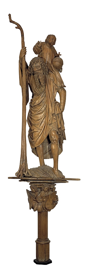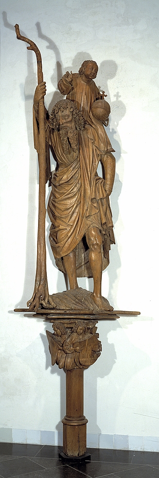 Christoffel, op kapiteel twee schilddragende engelen