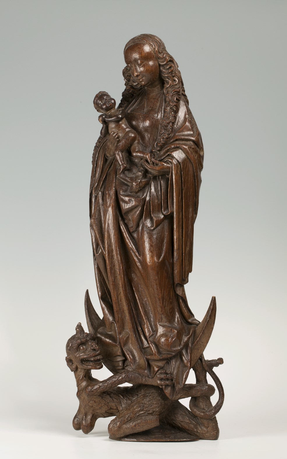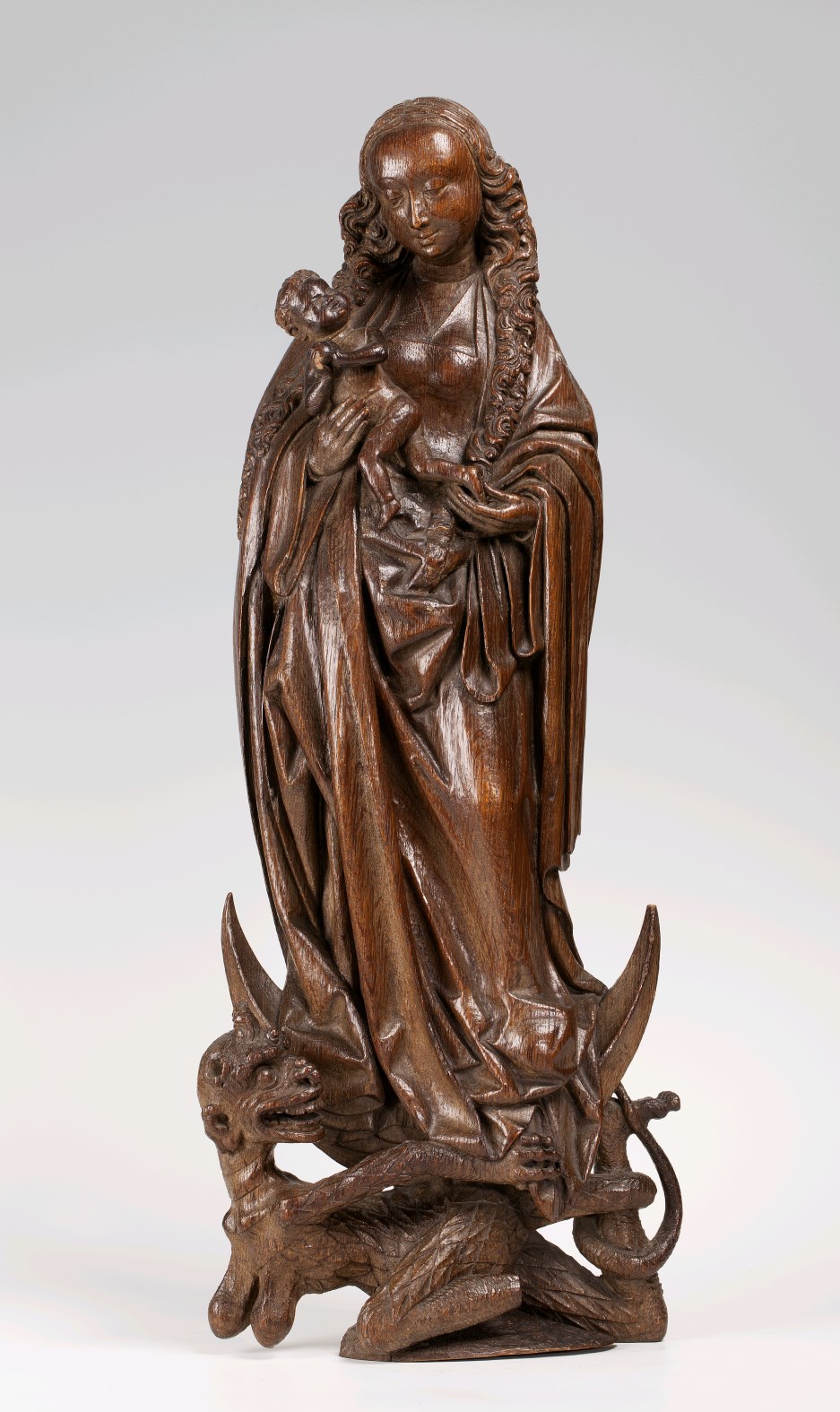 Maria is staande voorgesteld, rustend op haar rechterbeen. Ze staat op de maansikkel. Het naakte Christuskind rust voorover op haar rechterhand. Haar linkerhand houdt zijn rechtervoetje vast. Het kind houdt een appel in beide handjes, terwijl het zijn hoofdje naar zijn moeder omhoog wendt. Onder de maansikkel kronkelt de duivel, die in vrouwelijke gestalte met ...