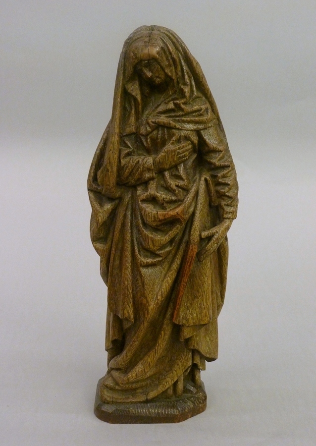Maria is staande voorgesteld, rustend op haar linkerbeen. Haar hoofd neigt naar links. Zij houdt haar rechterhand tegen de borst terwijl ze met haar linkerhand een slip van de mantel vasthoudt. Zij draagt een lang, rijkgeplooid bovenkleed met lange mouwen, dat ze onder haar linkerarm heeft opgenomen, waardoor het lange onderkleed en de punt van ...