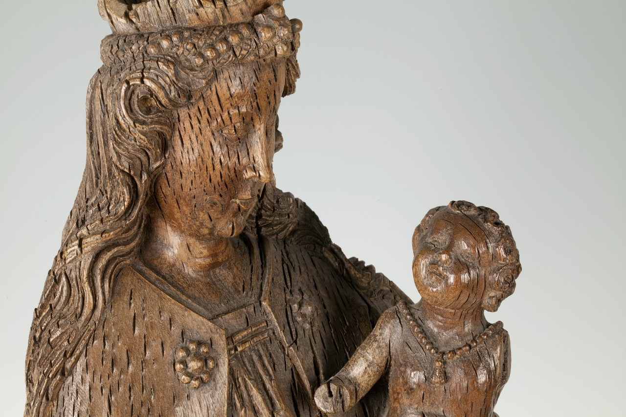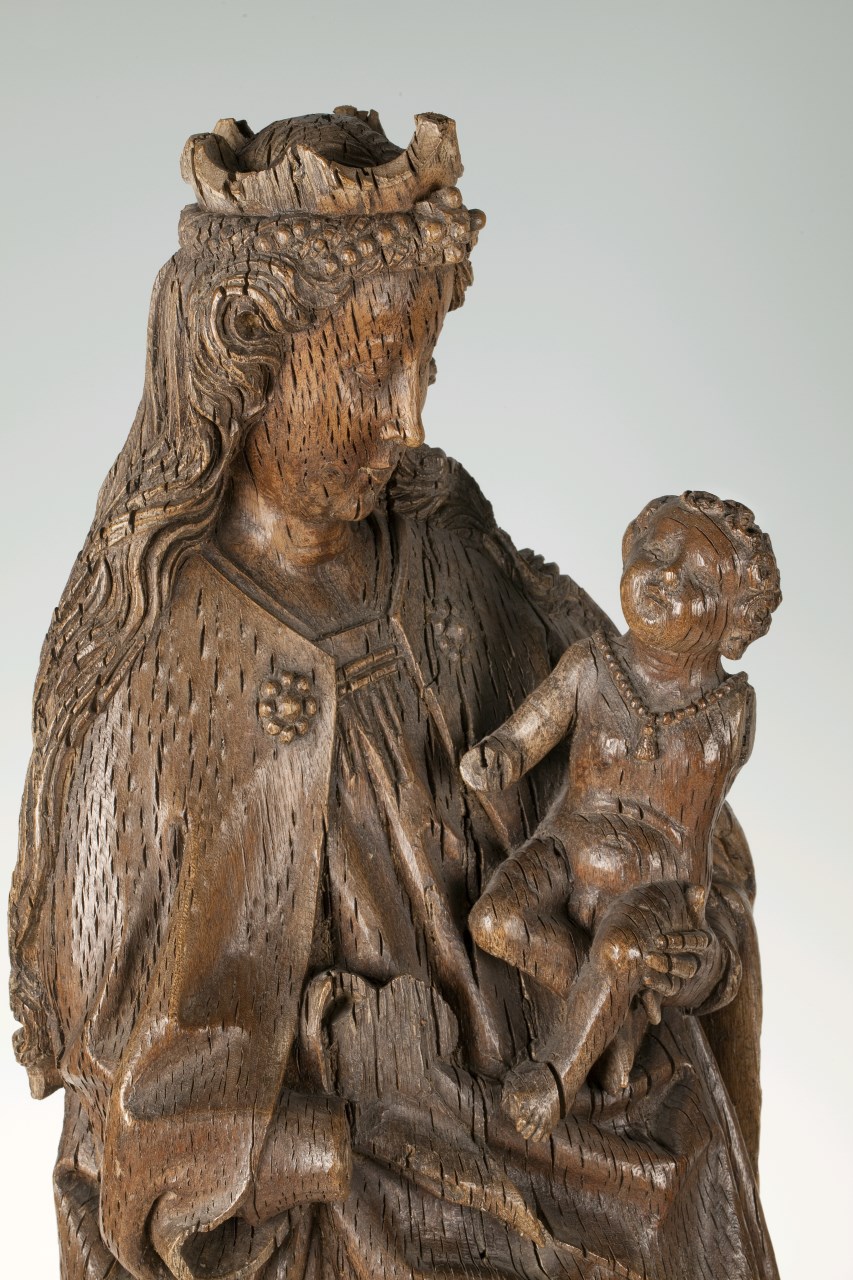 Maria staat met vooruitgeschoven rechterbeen op de maansikkel. Zij draagt het naakte Kind op haar linkerarm. Het kindje zit met gekruiste beentjes naar links gewend en kijkt naar zijn moeder op. Maria is gekleed in een lang gewaad en een mantel, die bij de hals door een mantelsnoer met rozetten wordt bijeengehouden. De mantel is ...