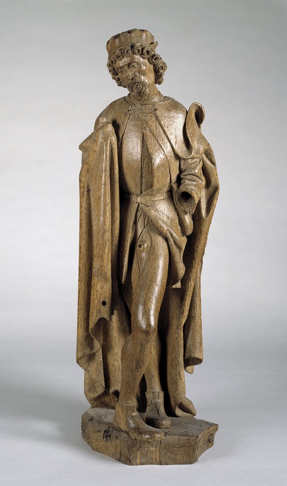 Rochus heeft zijn hoofd driekwart naar links gewend. Hij staat op zijn rechterbeen en heeft zijn linkerbeen met naar buiten gedraaide voet kruislings voor het andere geplaatst. Hij hield met zijn nu verdwenen linkerhand de punt van zijn kleed opzij, om de doorgebroken pestbuil te tonen, die in een gat van zijn kous op zijn ...