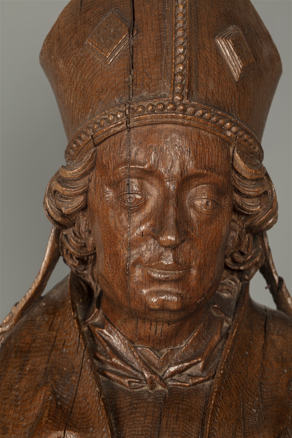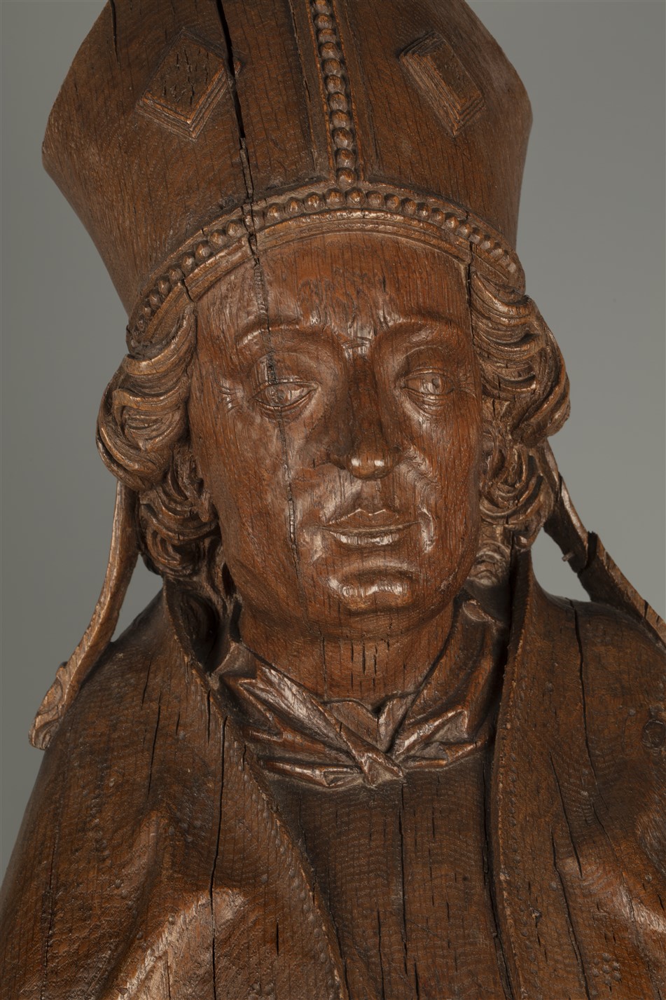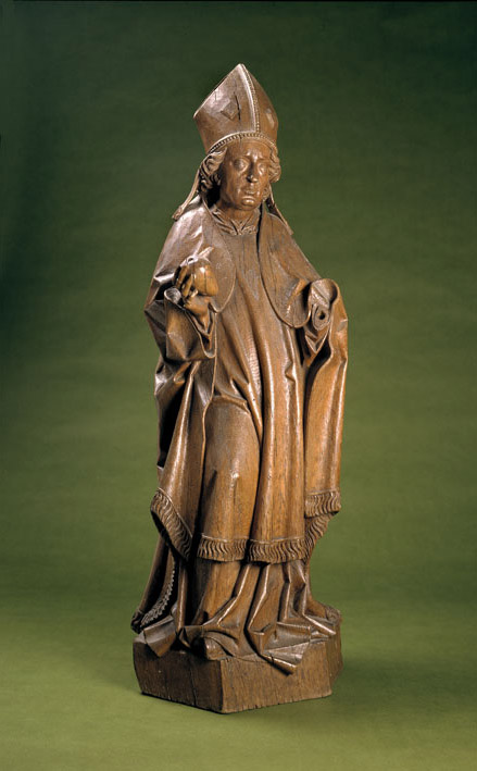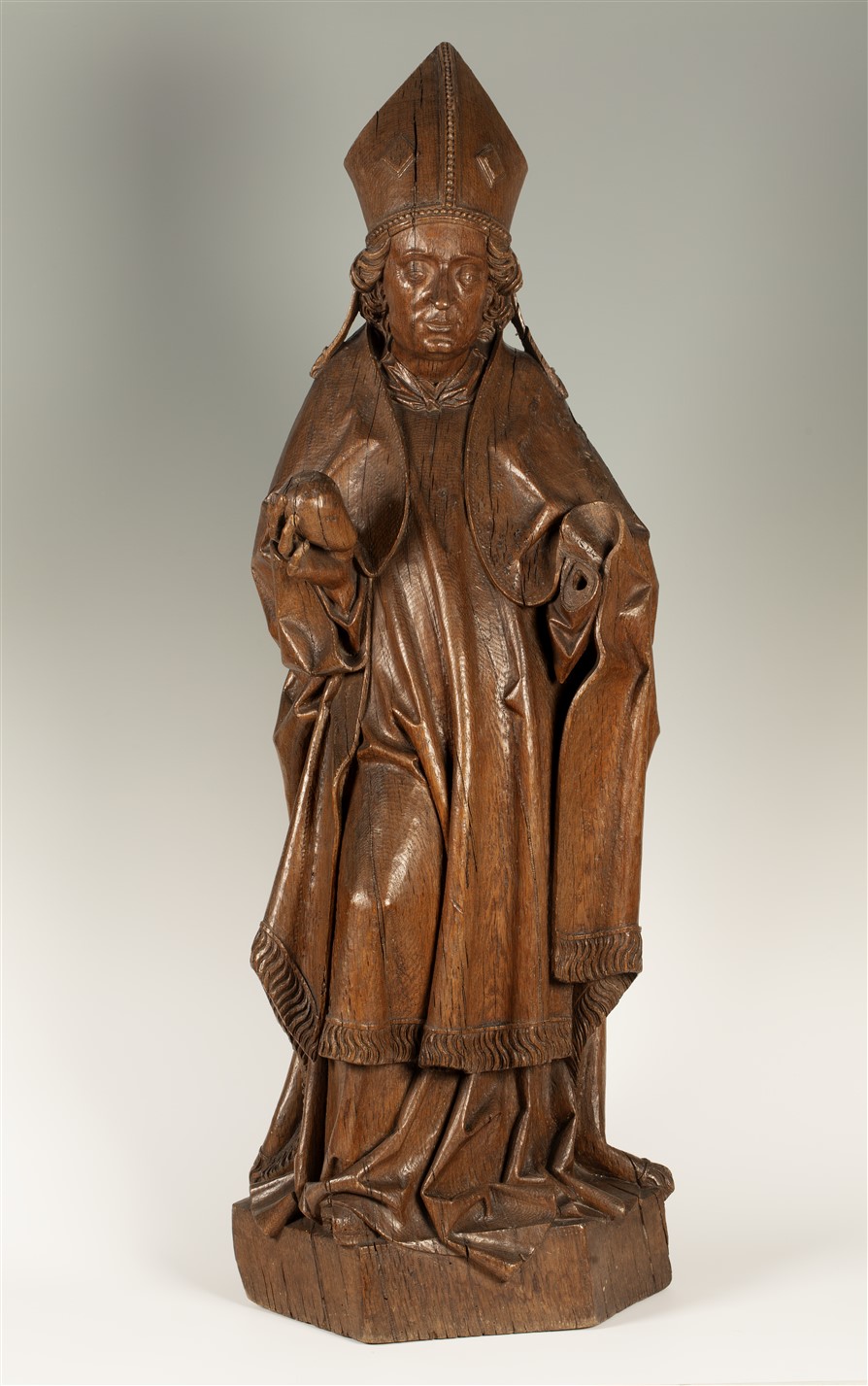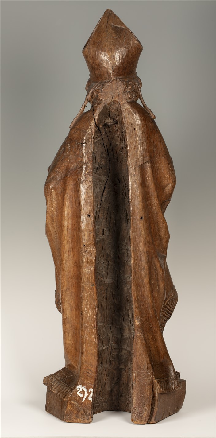 Augustinus is staande voorgesteld, rustend op zijn linkerbeen. In zijn rechterhand, waaraan drie ringen, houdt hij zijn attribuut: het hart. Dit was oorspronkelijk doorboord met pijlen, die nu afgebroken zijn. Uit de bovenkant van het hart kwamen vlammen. De heilige staat op een zeskantig voetstuk met ingezwenkte zijden. De kerkvader is gekleed in bisschoppelijk ornaat. ...