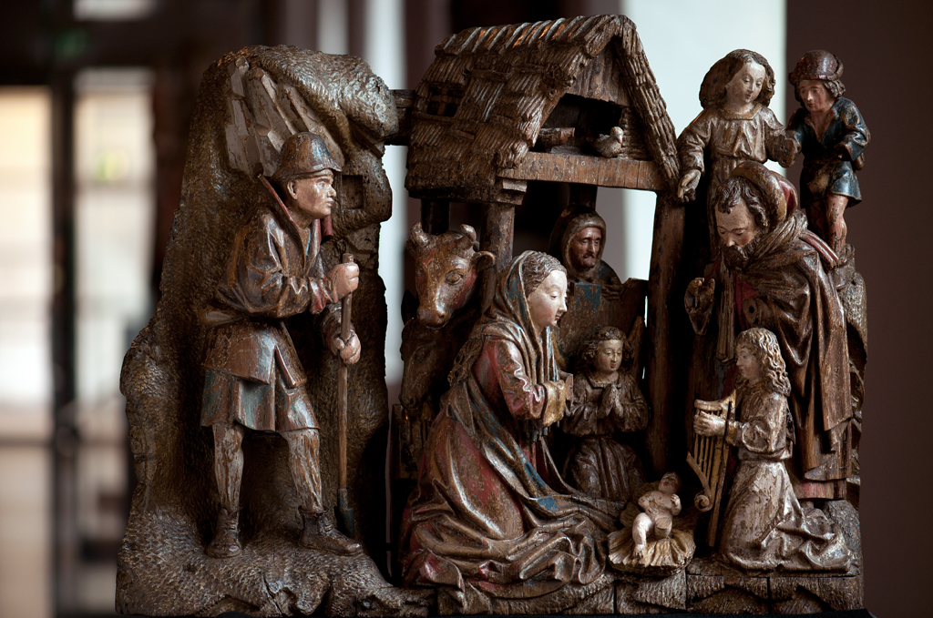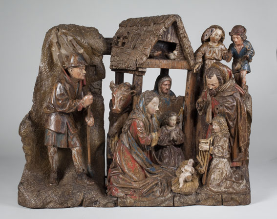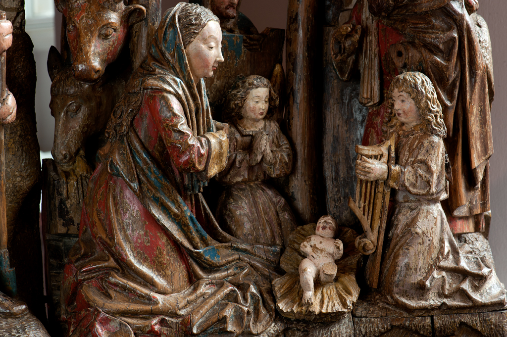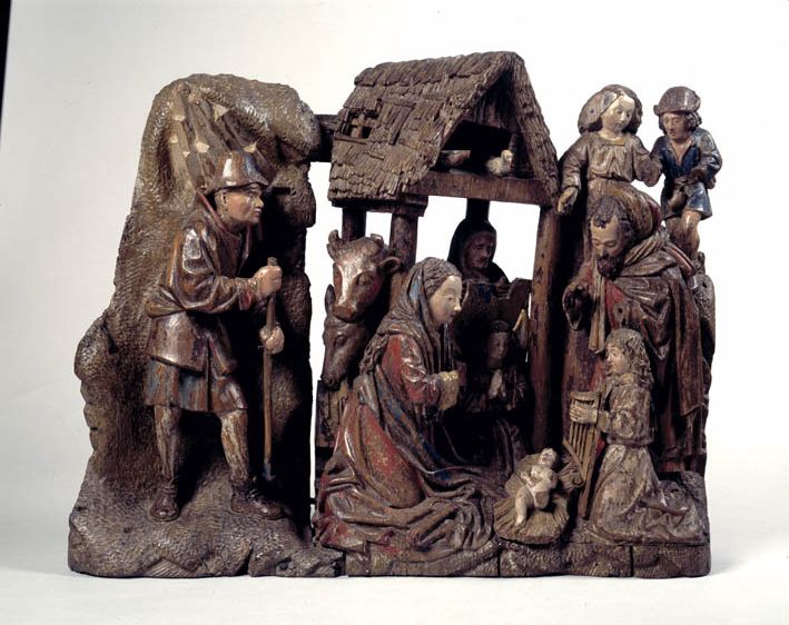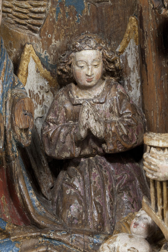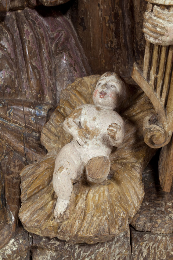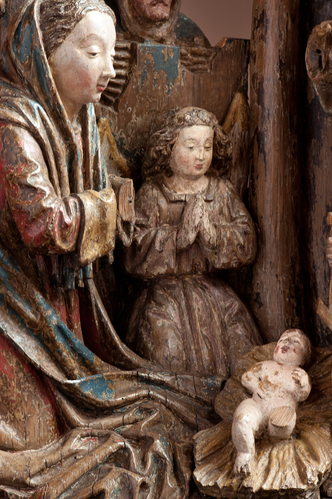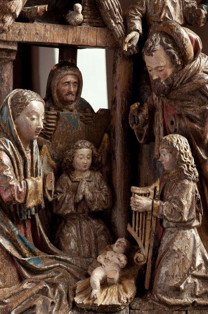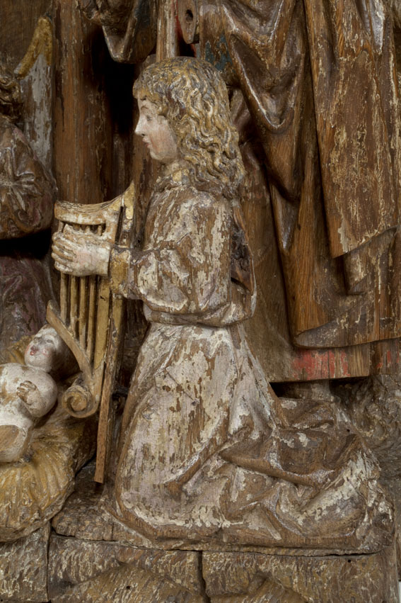 Voor een vervallen stal in het midden van de voorstelling, knielt Maria links in aanbidding neer bij het kindje, dat in het stro ligt. Ook zijn twee engelen bij het kind neergeknield. De ene, en profil rechts op de voorgrond, bespeelt een harp, die hij voor zich houdt. De andere zit schuin achter het kindje, ...