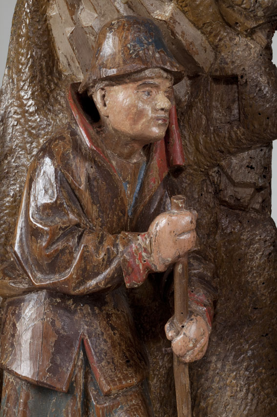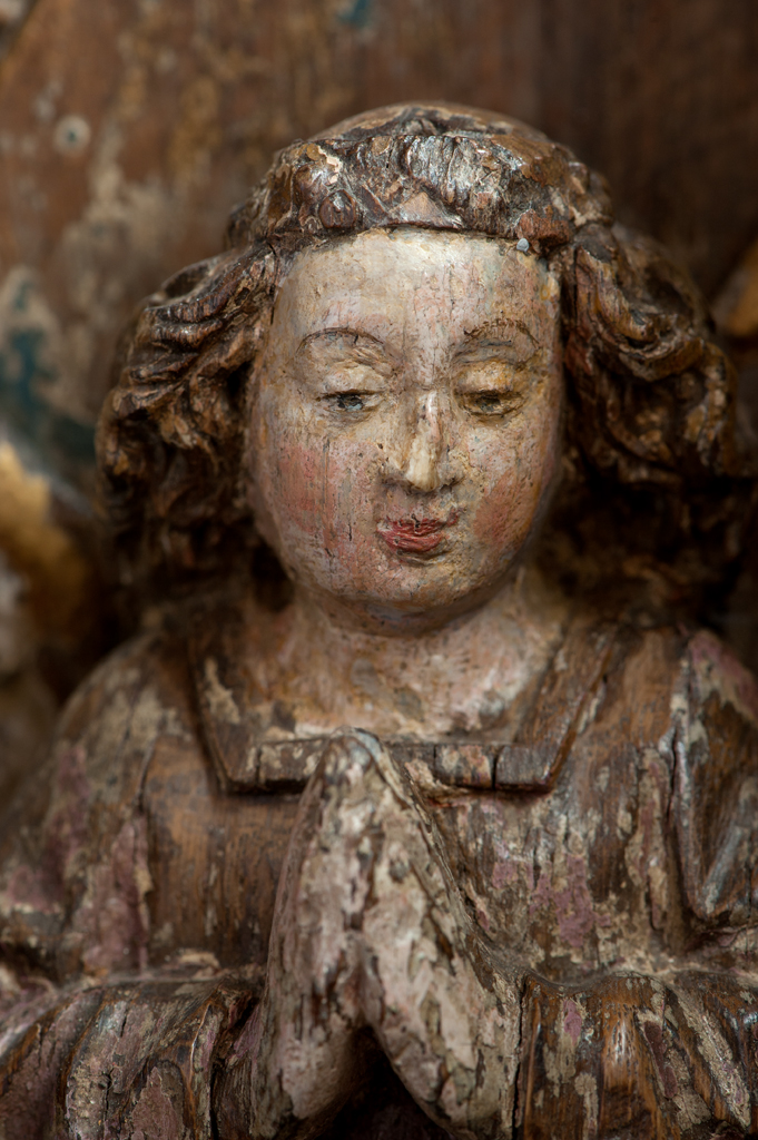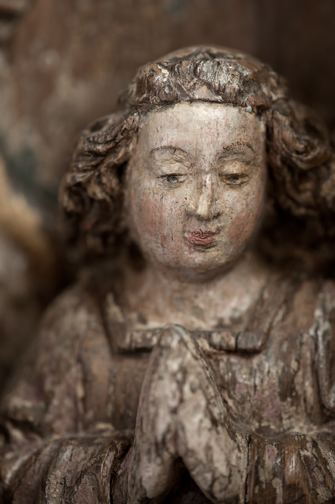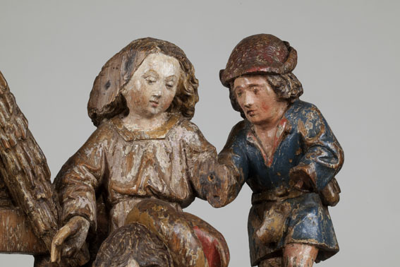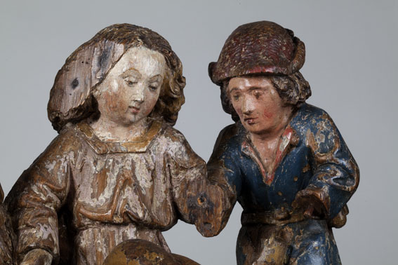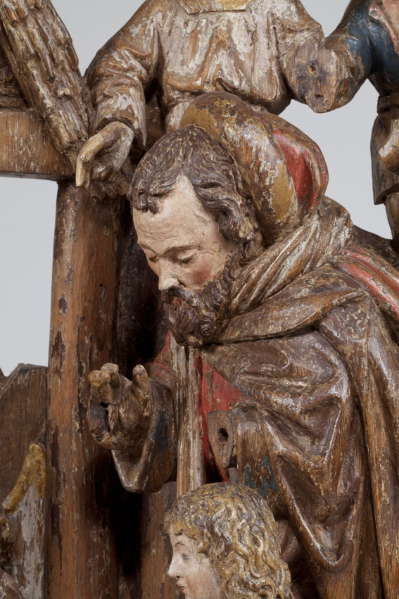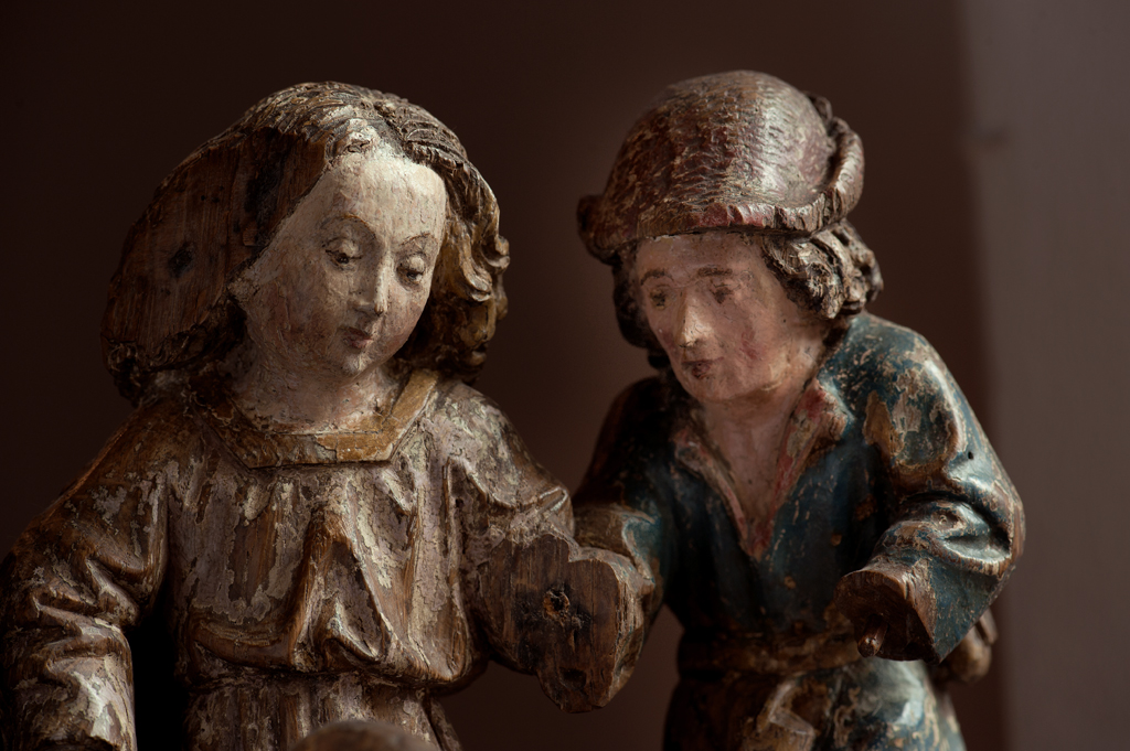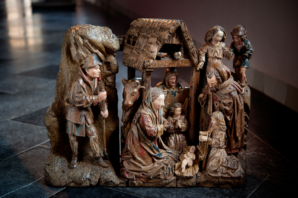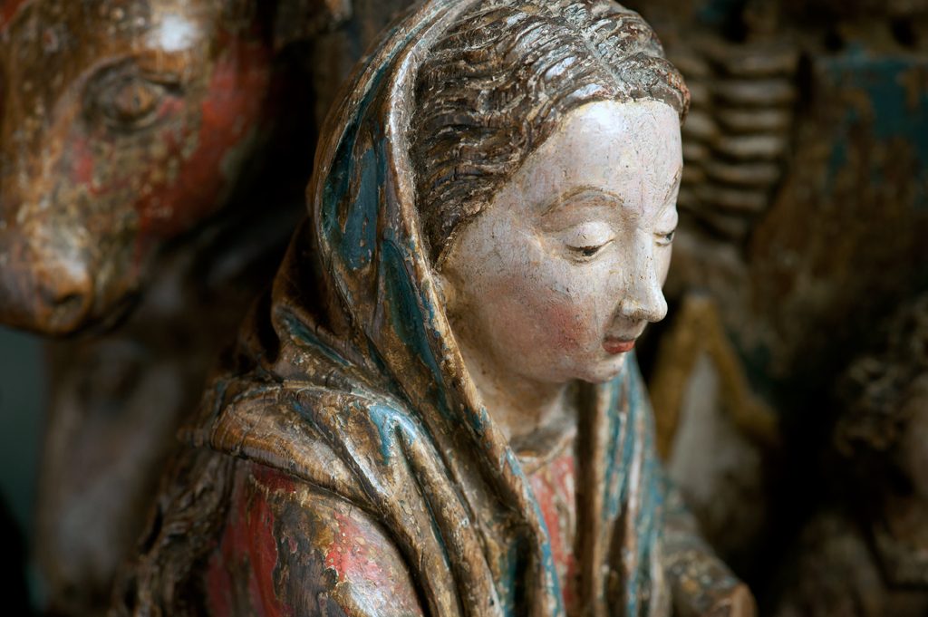 Voor een vervallen stal in het midden van de voorstelling, knielt Maria links in aanbidding neer bij het kindje, dat in het stro ligt. Ook zijn twee engelen bij het kind neergeknield. De ene, en profil rechts op de voorgrond, bespeelt een harp, die hij voor zich houdt. De andere zit schuin achter het kindje, ...