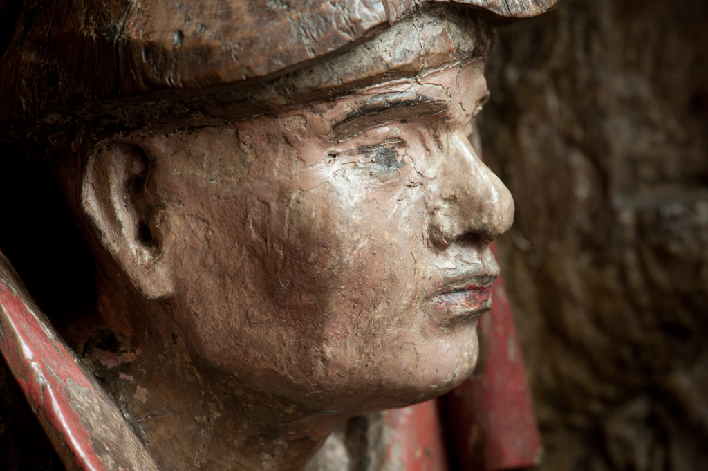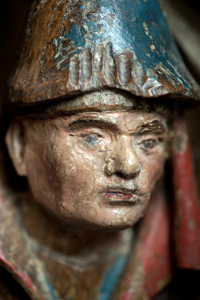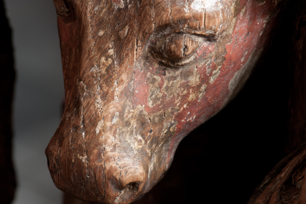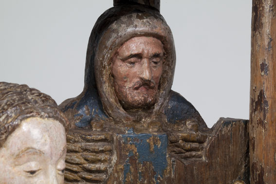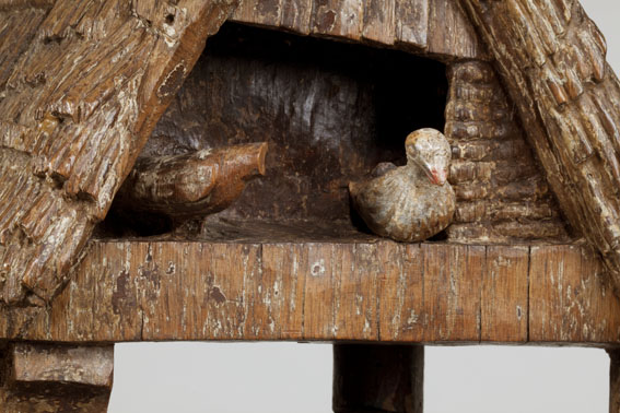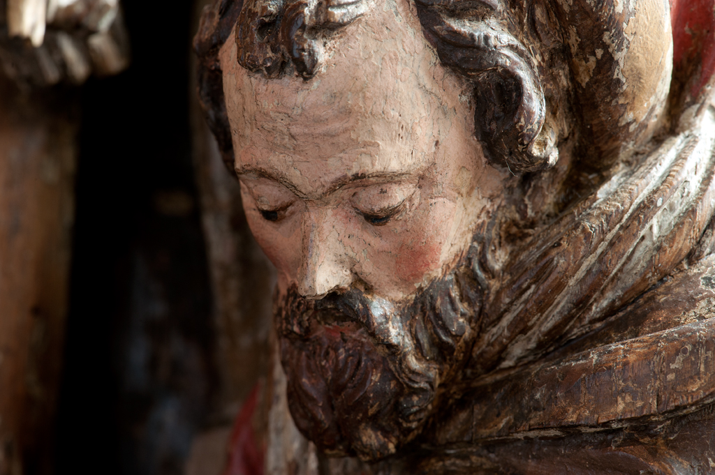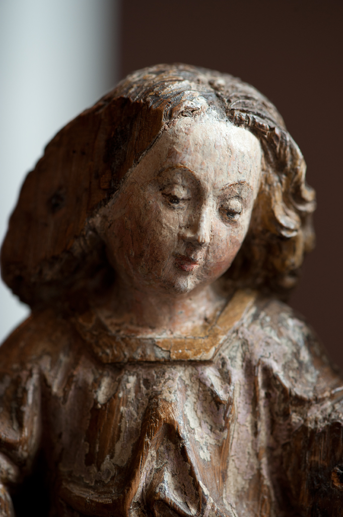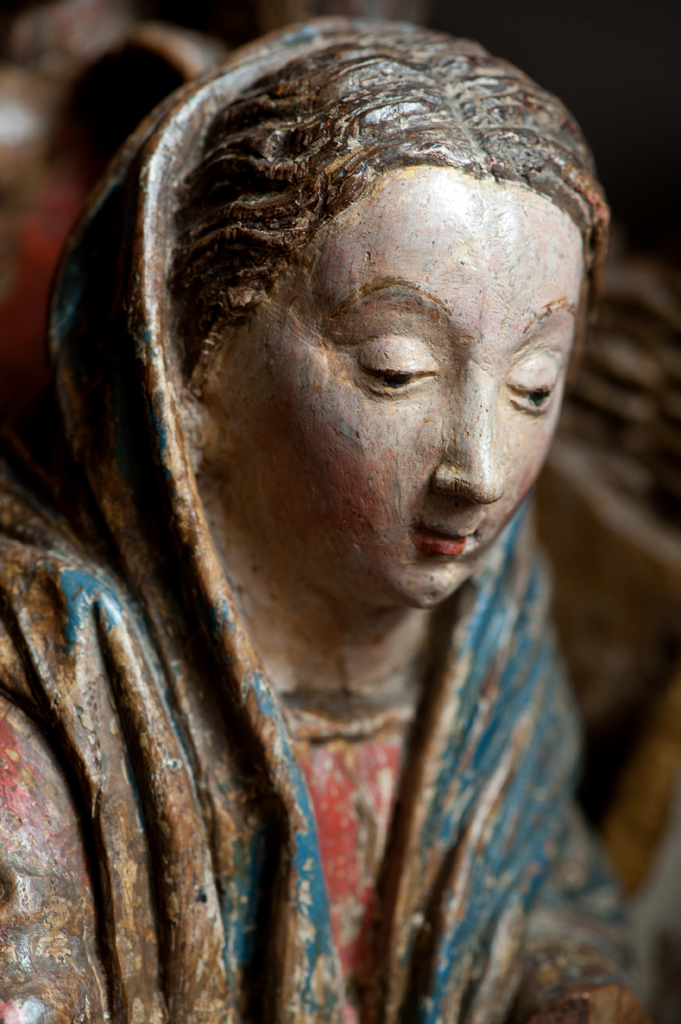 Voor een vervallen stal in het midden van de voorstelling, knielt Maria links in aanbidding neer bij het kindje, dat in het stro ligt. Ook zijn twee engelen bij het kind neergeknield. De ene, en profil rechts op de voorgrond, bespeelt een harp, die hij voor zich houdt. De andere zit schuin achter het kindje, ...