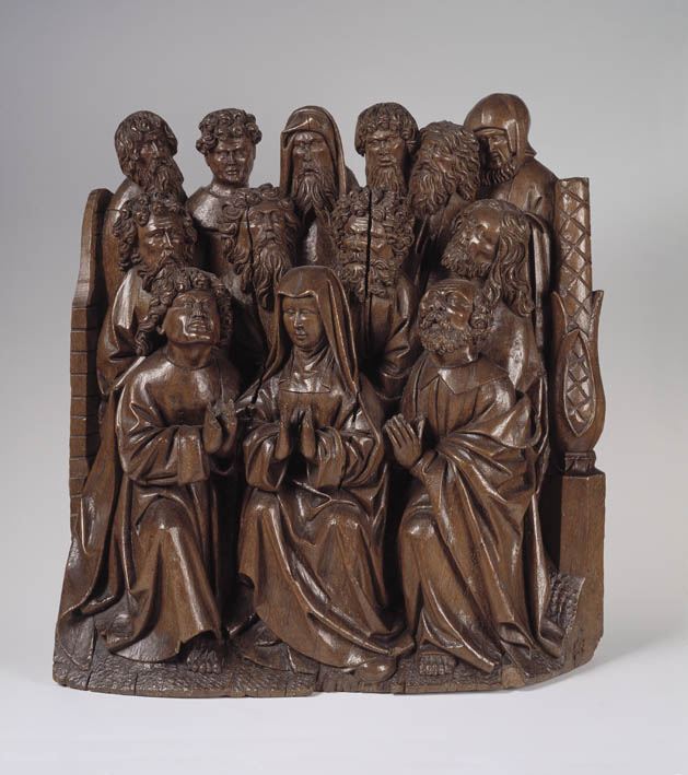 Maria en de apostelen zitten in gebed bijeen in drie rijen achter elkaar. Maria zit vooraan tussen Johannes en Petrus. Johannes is baardeloos. Het vertrek is begrensd door een stuk muur aan de linkerzijde en een fragment van een kandelaberzuil met ruitmotief aan de rechterzijde. De groep is geplaatst op een met fijne zigzaggroeven aangeduide, ...