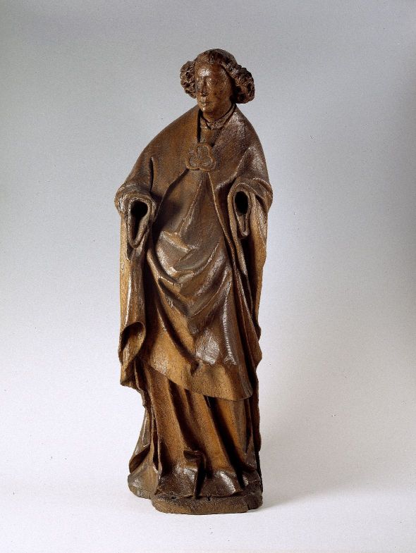 De engel is staande voorgesteld, rustend op zijn linkerbeen, het rechterbeen gebogen. Hij heeft zijn gezicht driekwart naar rechts gewend en houd zijn armen gebogen tegen zijn lichaam. Zijn ovale gelaat met kleine ogen wordt omgeven door wijd uitstaande krullen. Hij staat op een grond die is afgewerkt met zigzaggroeven. De engel is gekleed in ...