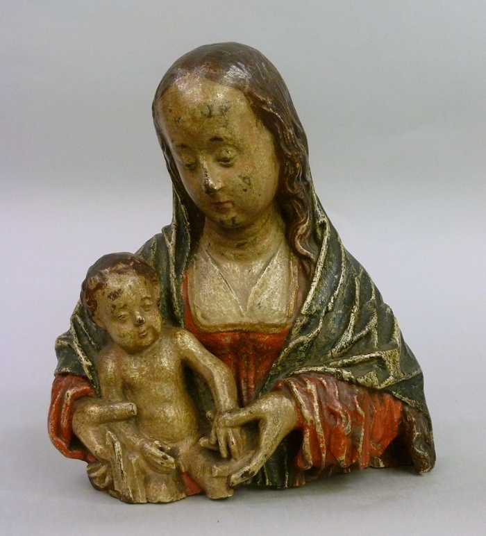 Maria draagt het naakte kind in haar rechterarm en houdt met haar linkerhand zijn linkerhandje vast. Met haar rechterhand omvat ze het rechterarmpje van het kind en een slip van haar mantel. Ze heeft haar hoofd iets naar links gewend en kijkt naar beneden. Zij is gekleed in een gewaad waarvan de vierkante halsuitsnijding het ...