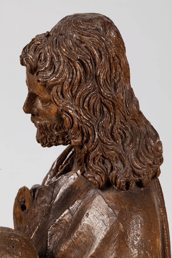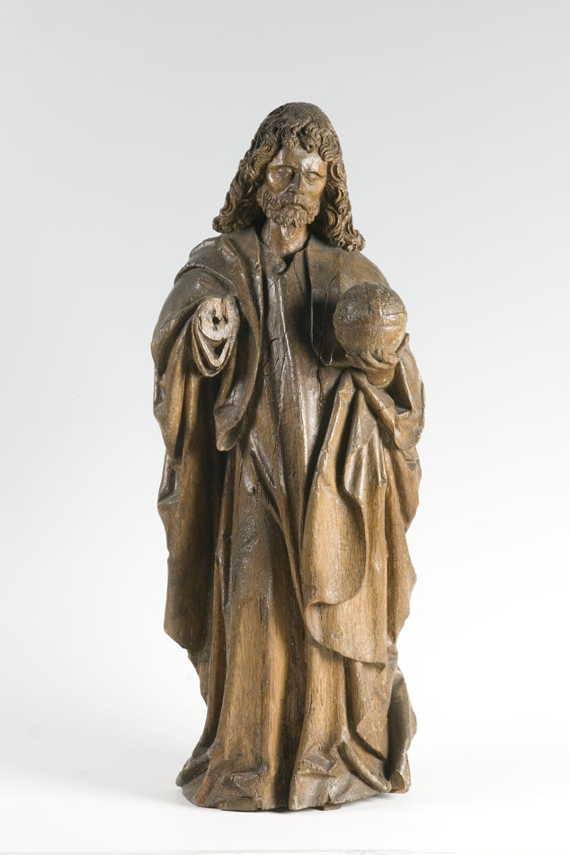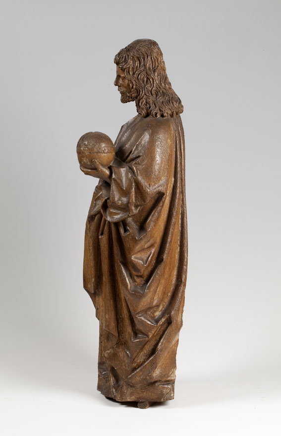 Christus is staande voorgesteld, rustend op zijn linkerbeen. Hij heeft zijn door lange lokken omgeven gelaat iets naar rechts gewend. In zijn linkerhand draagt hij de wereldbol, zijn nu verdwenen rechterhand was zegenend opgeheven. Hij is gekleed in een tunica met wijde hals, die tot over zijn voeten en de grond afhangt. Zijn wijde mantel ...