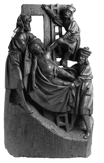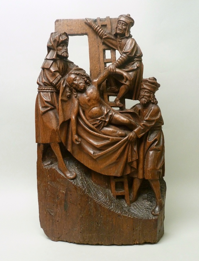 Op een rotsachtige bodem, die naar links sterk oploopt, staan twee mannen (Jozef van Arimathea en Nicodemus) die het lichaam van Christus voorzichtig in een grote doek van het kruis neerlaten. De linkerfiguur steunt Christus bij de schouders, de rechter houdt met beide handen de doek vast ter hoogte van Christus' knieën. Een derde man ...