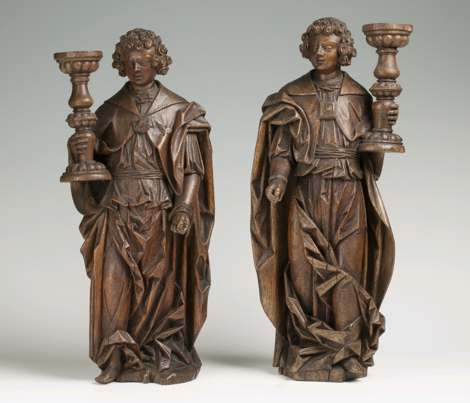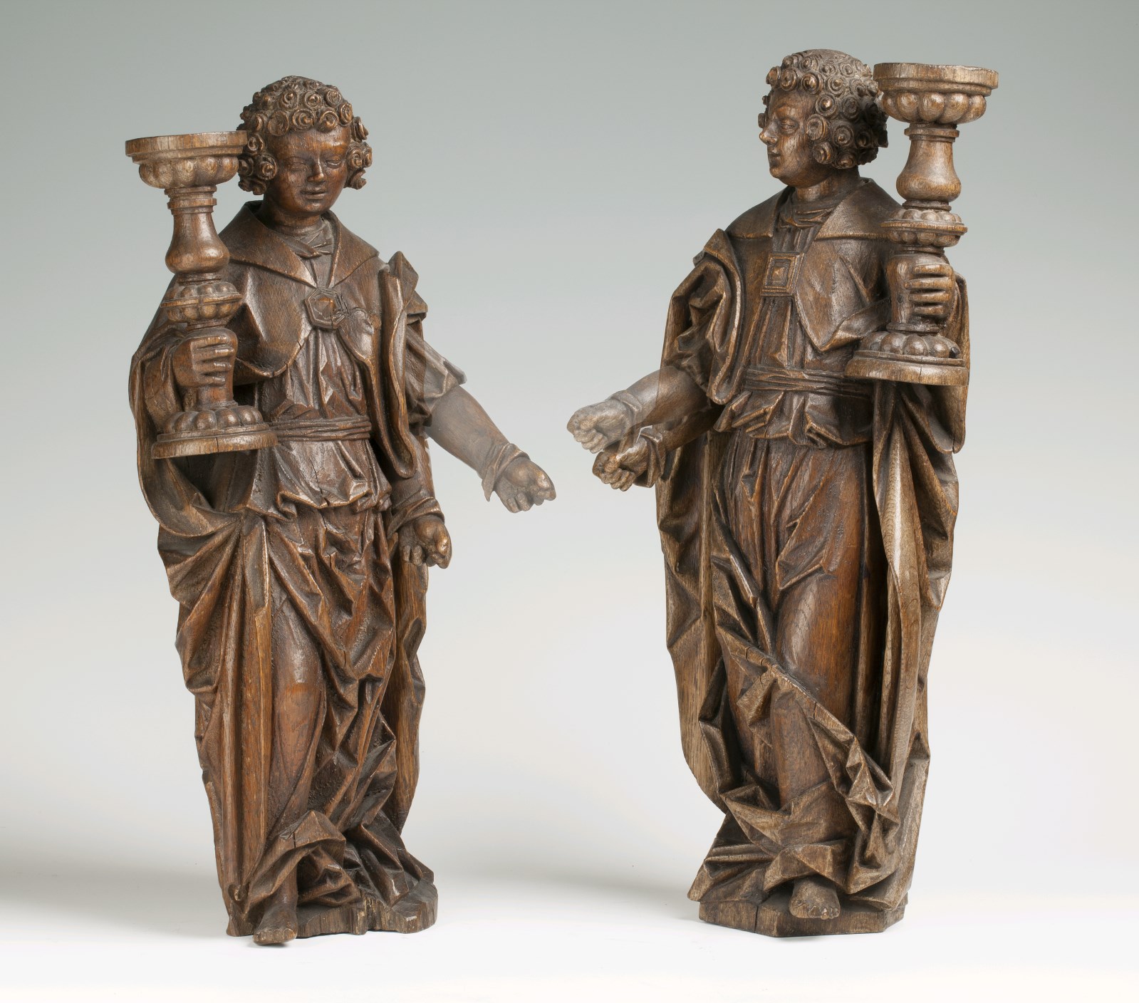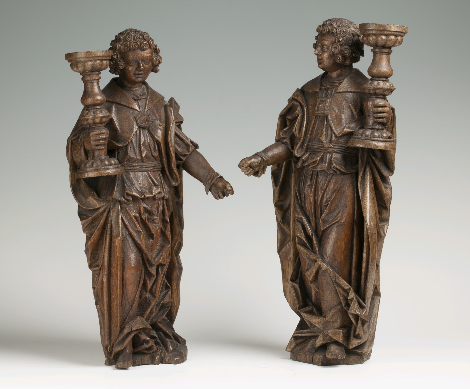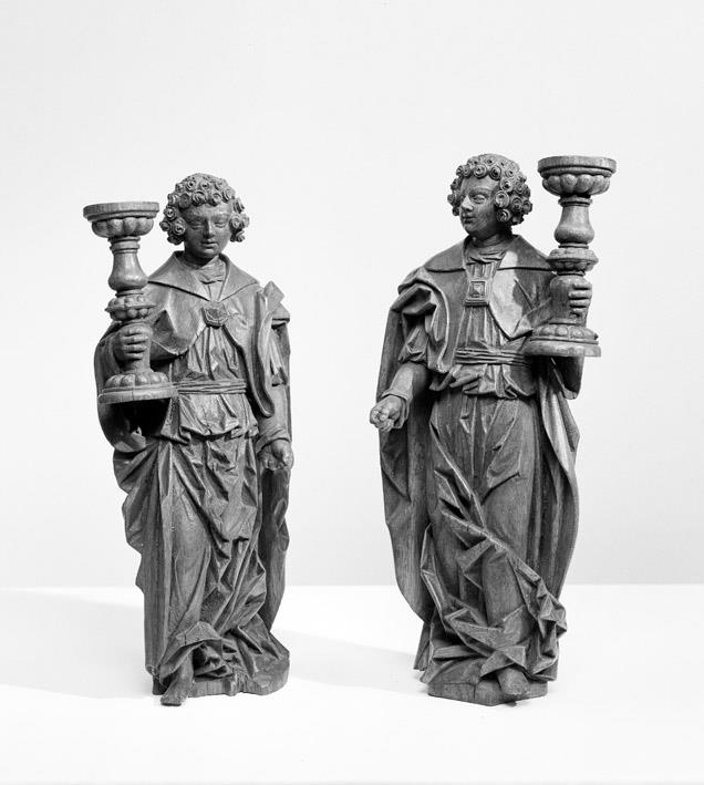 Beide engelen zijn lopend voorgesteld. Ze zijn ongeveer spiegelbeeldig aan elkaar. Zij houden een kandelaar in de hand. ABM bh298 draagt de kandelaar in de rechterhand. Zijn rechterbeen is iets naar voren geplaatst. ABM bh299 draagt de kandelaar in de linkerhand en heeft zijn linkerbeen iets naar voren geschoven. Zijn gezicht is driekwart naar links ...