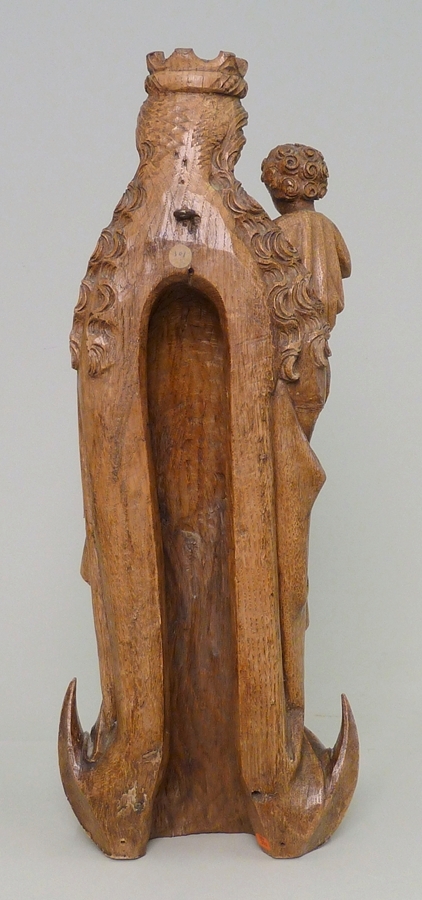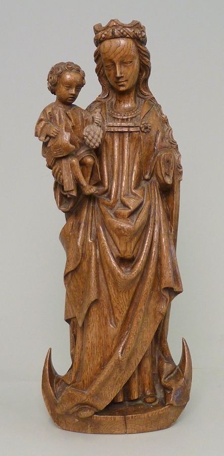 Maria, staande op de halve maan, is gekleed in een lang geplooid gewaad, waaroverheen een mantel gedrapeerd is. Op het hoofd draagt zij een kroon. Het Kind op haar rechterarm is gekleed in een lang gewaad en heeft in de ene hand een duif, in de andere een druiventros. Ontbreken: linkerhand van Maria, punten van ...
