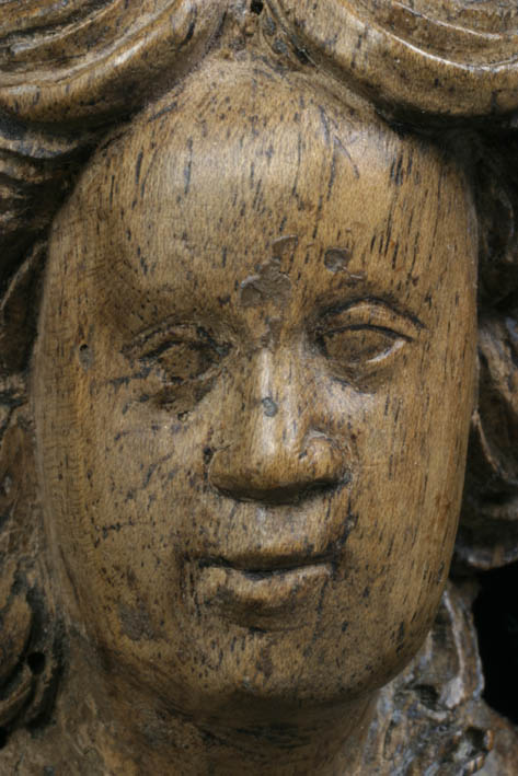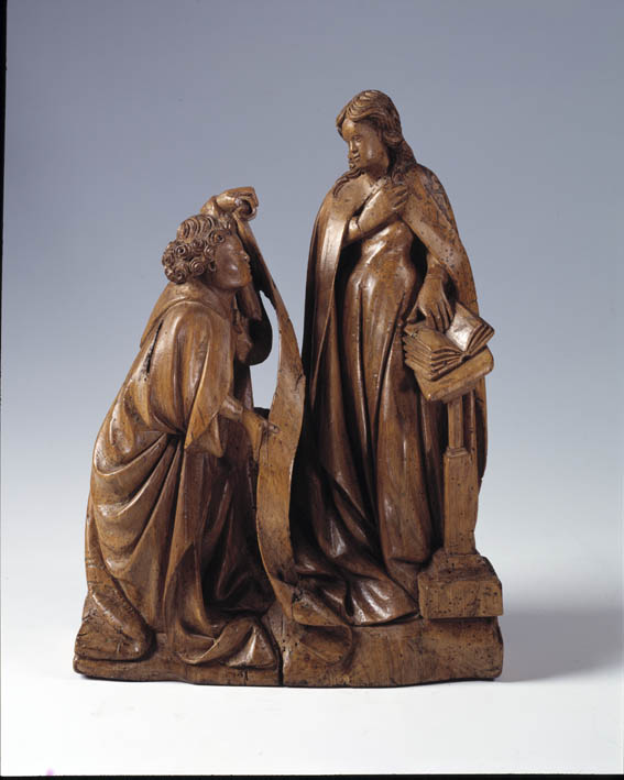 Rechts staat Maria bij een lezenaar. Haar linkerhand rust op een daarop gelegen, opengeslagen boek. Zij heeft zich omgewend naar de engel Gabriël en heeft haar rechterhand op haar borst gelegd. Gabriël knielt aan de linkerzijde en houdt haar met twee handen een banderol voor. Maria draagt een kleed met nauwe taille dat in sluike ...