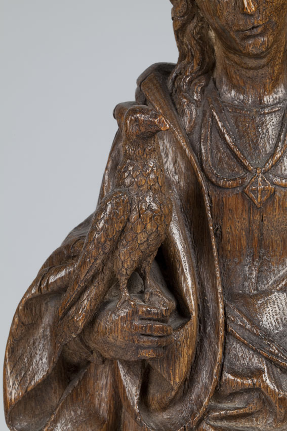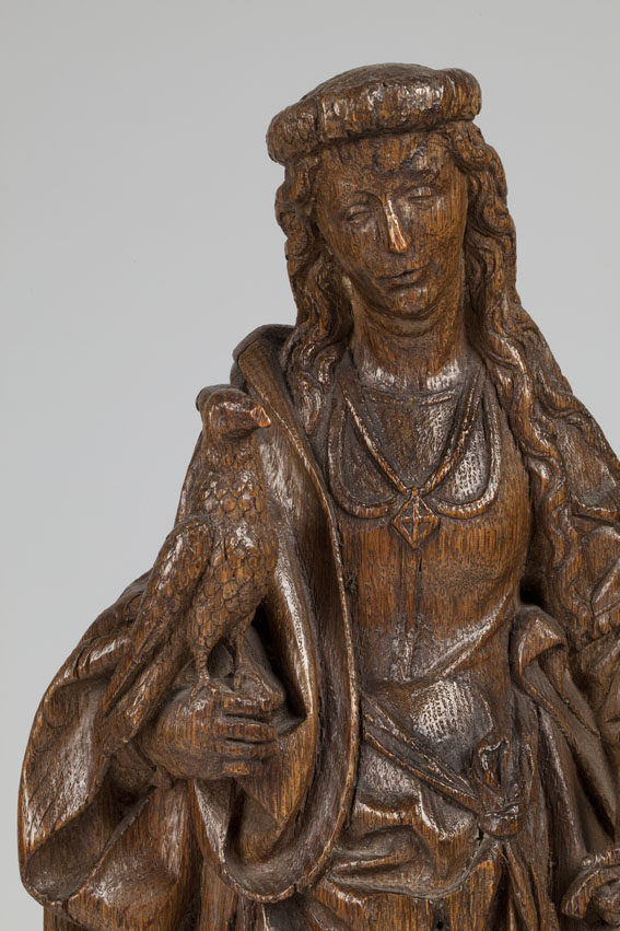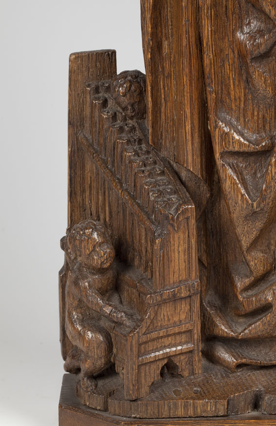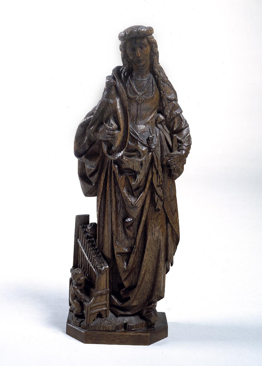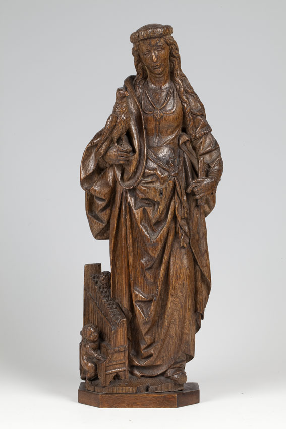 Cecilia is staande voorgesteld, rustend op haar rechterbeen. Ze draagt een valk op haar rechterhand; in de linker houdt zij een zwaard. Rechts van haar staat een orgeltje op de grond, dat door twee engeltjes wordt bespeeld. Het voorste engeltje bespeelt de toetsen, het achterste engeltje, waarvan het kopje achter het orgel uitkijkt, staat met ...