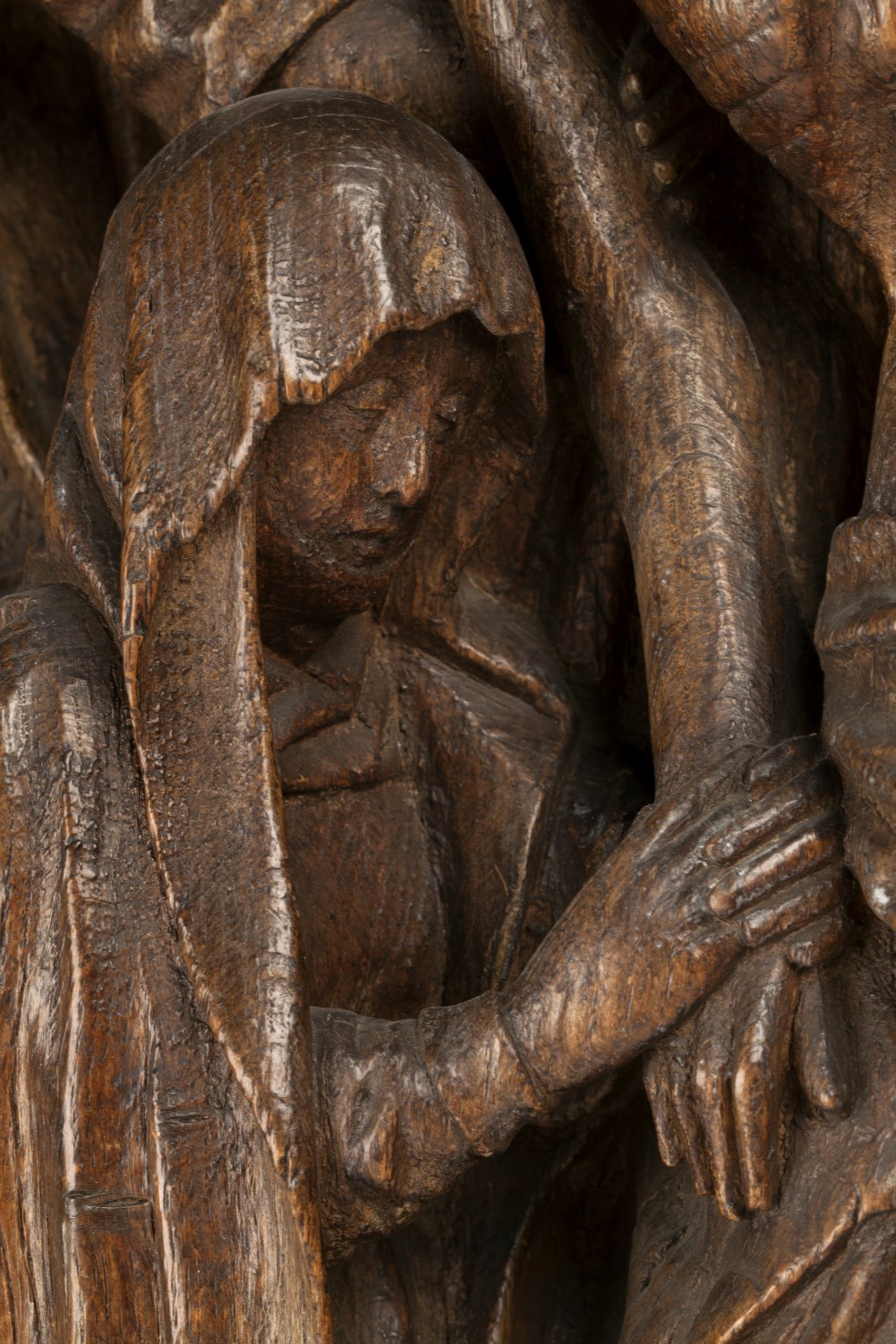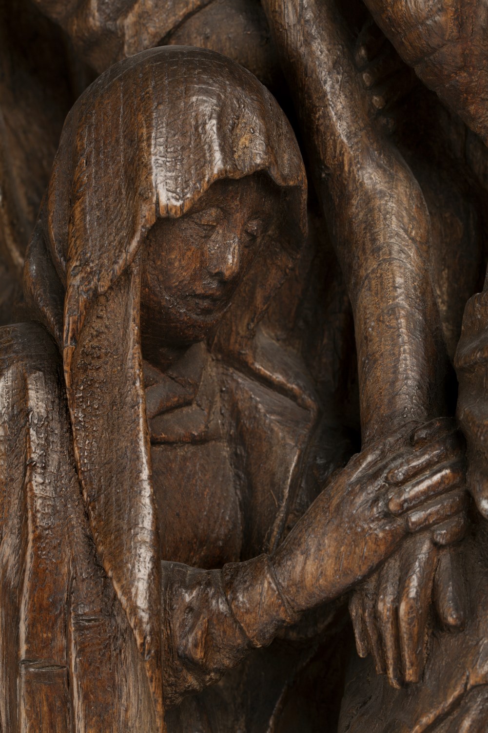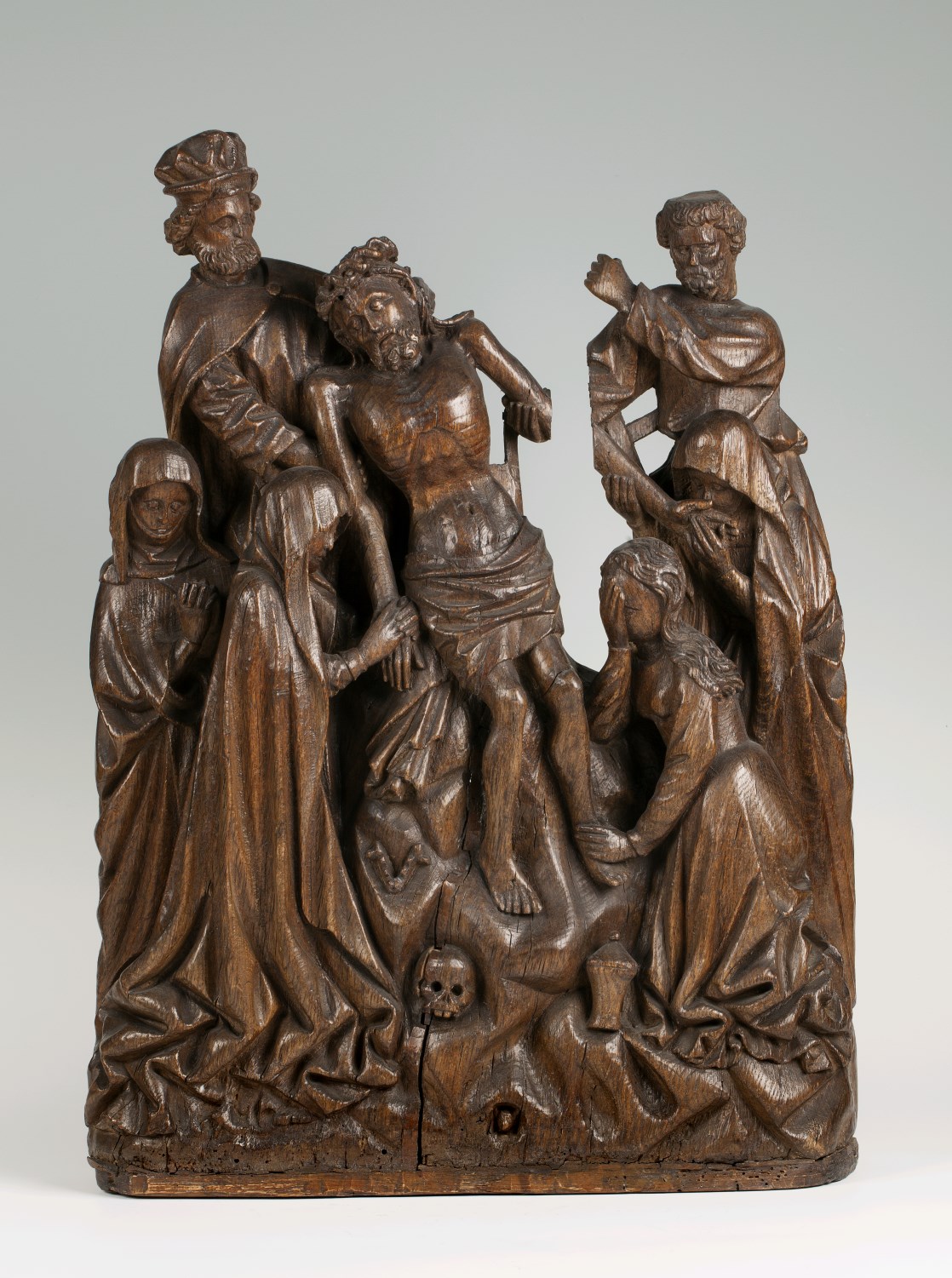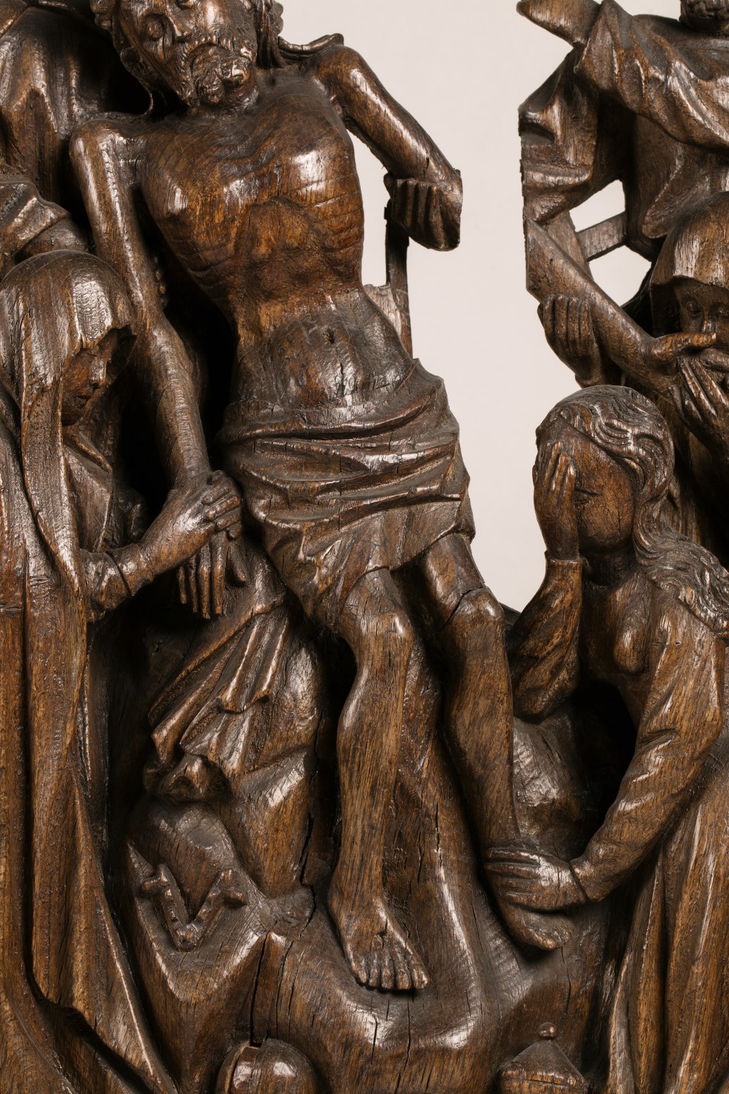Het lichaam van Christus, dat van het kruis wordt genomen, wordt door twee mannen gedragen, van wie de linkerfiguur met muts als Jozef van Arimathea wordt gezien en de rechter, blootshoofds, als Nicodemus. Nicodemus staat op een nu deels verdwenen ladder waar hij zich met zijn linkerhand nog aan vasthoudt. Op de voorgrond vier vrouwen. ...
