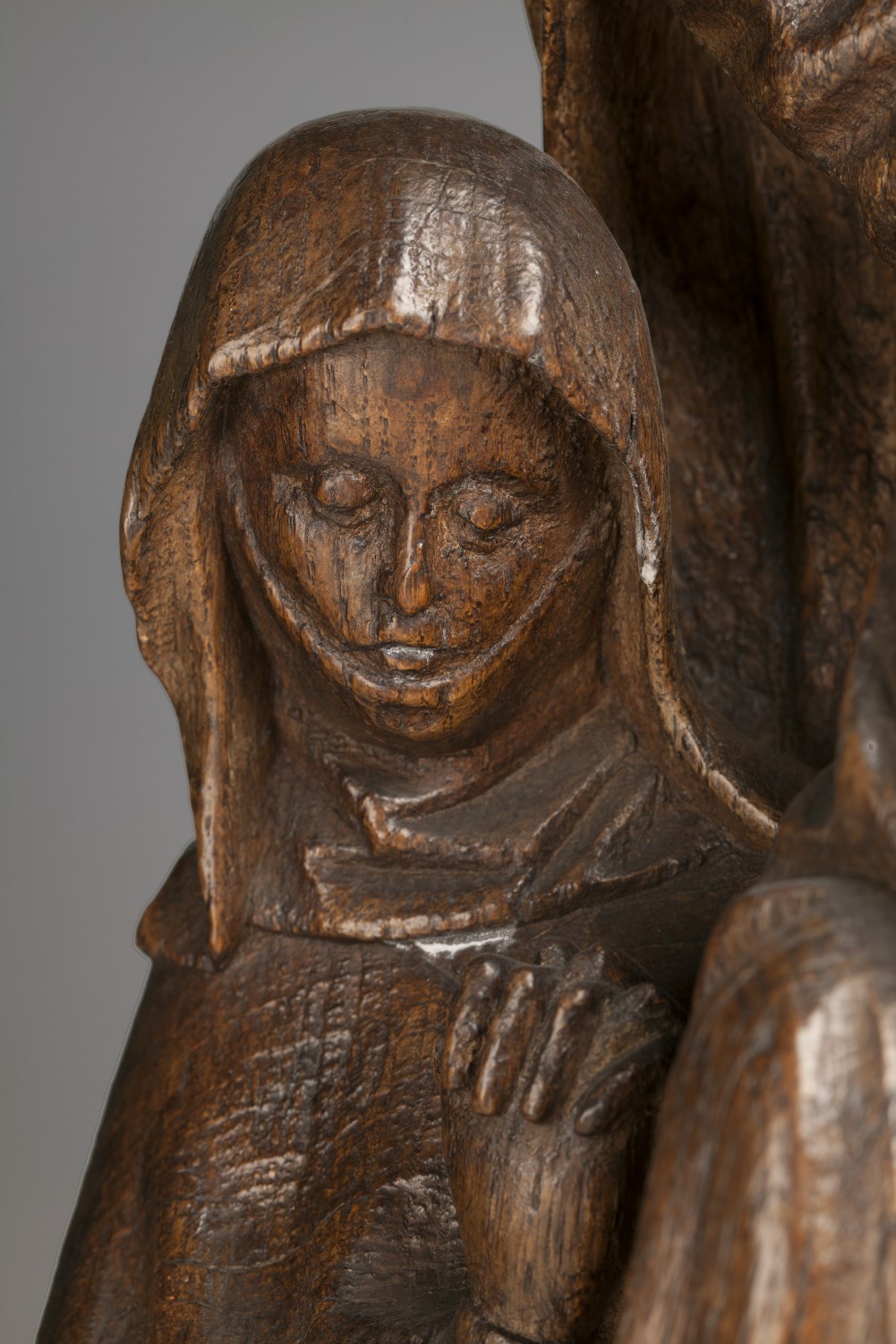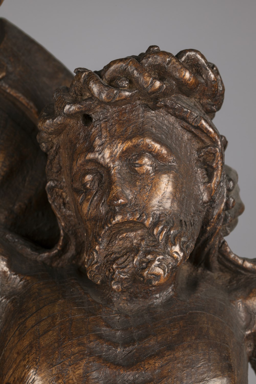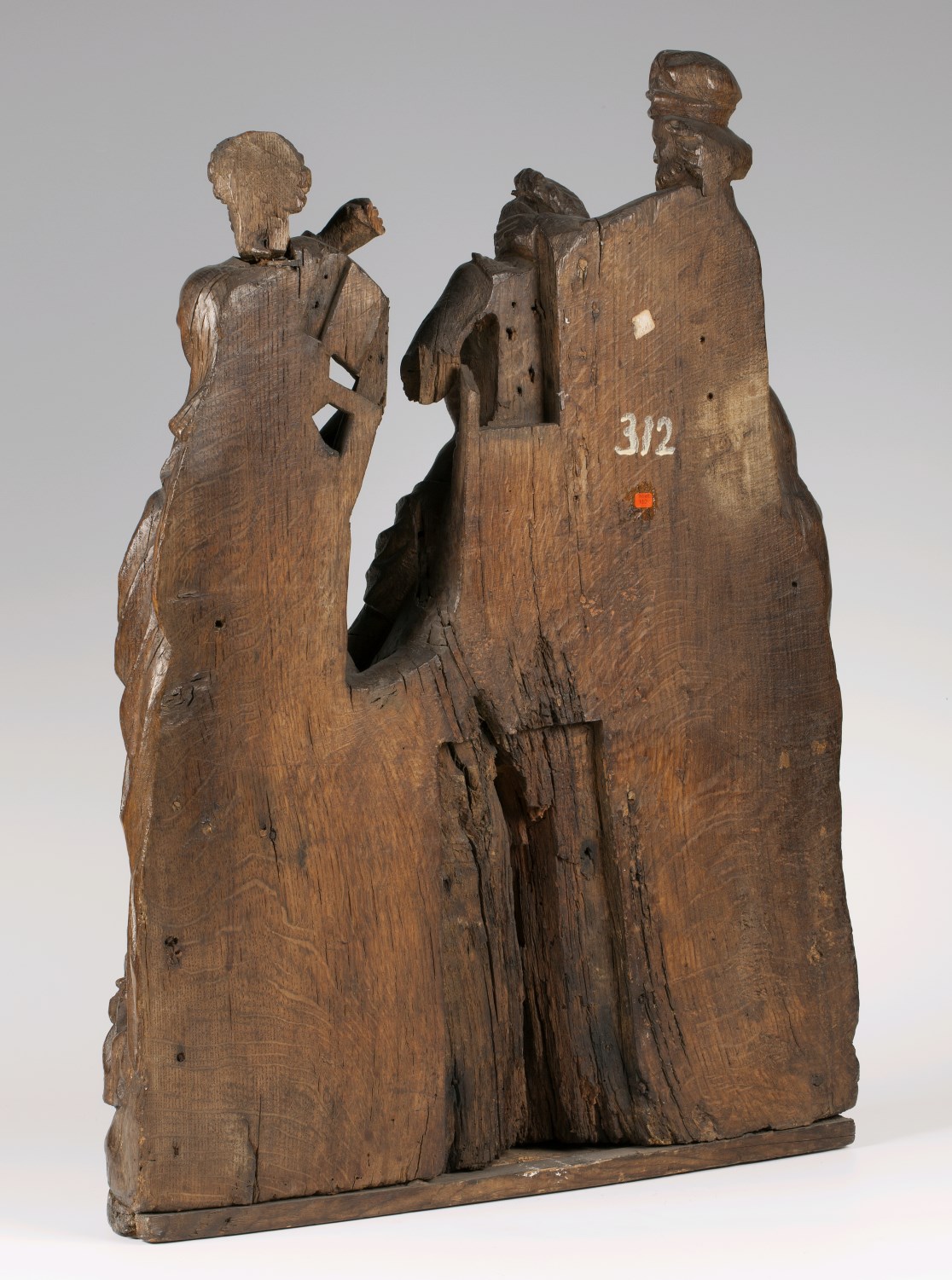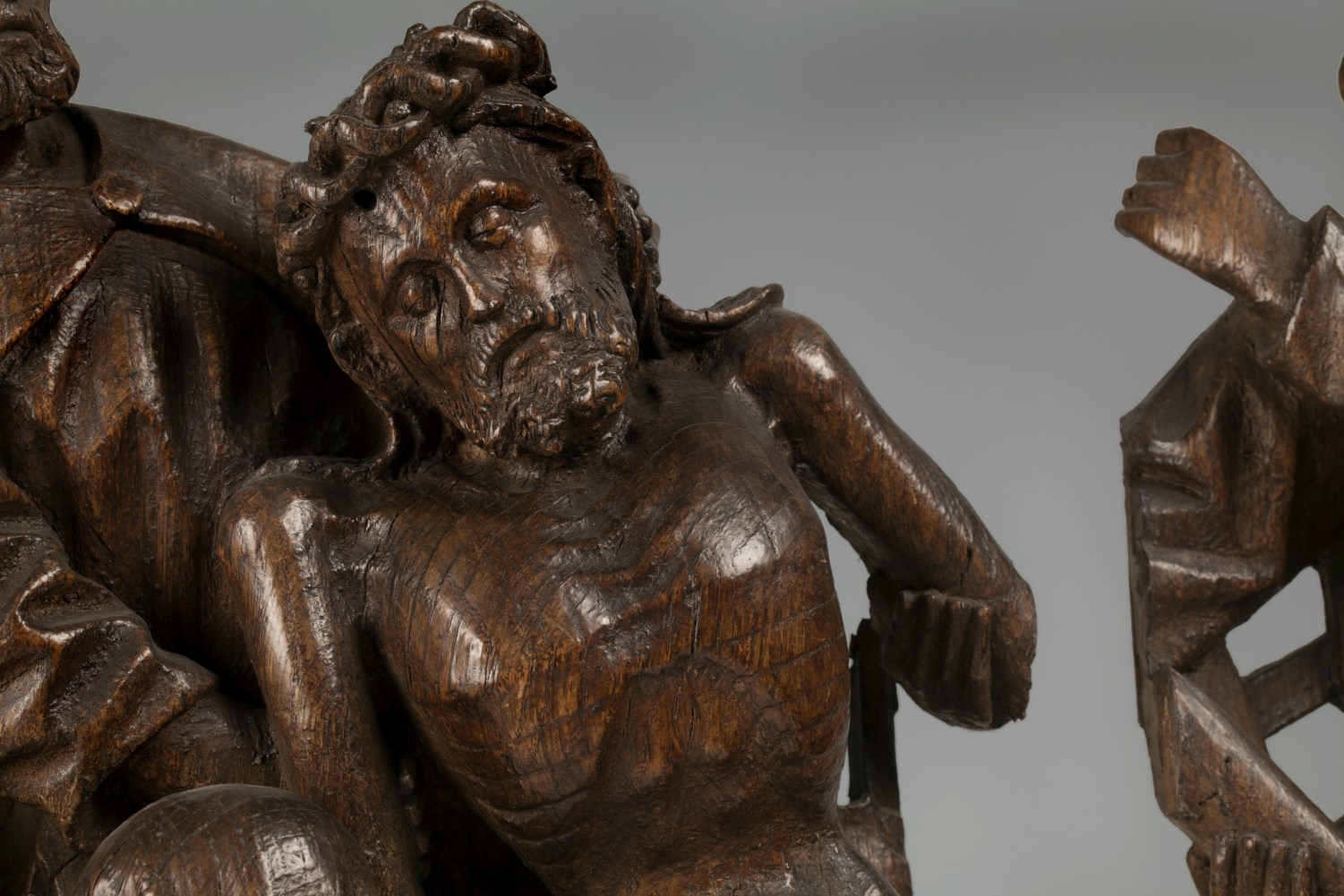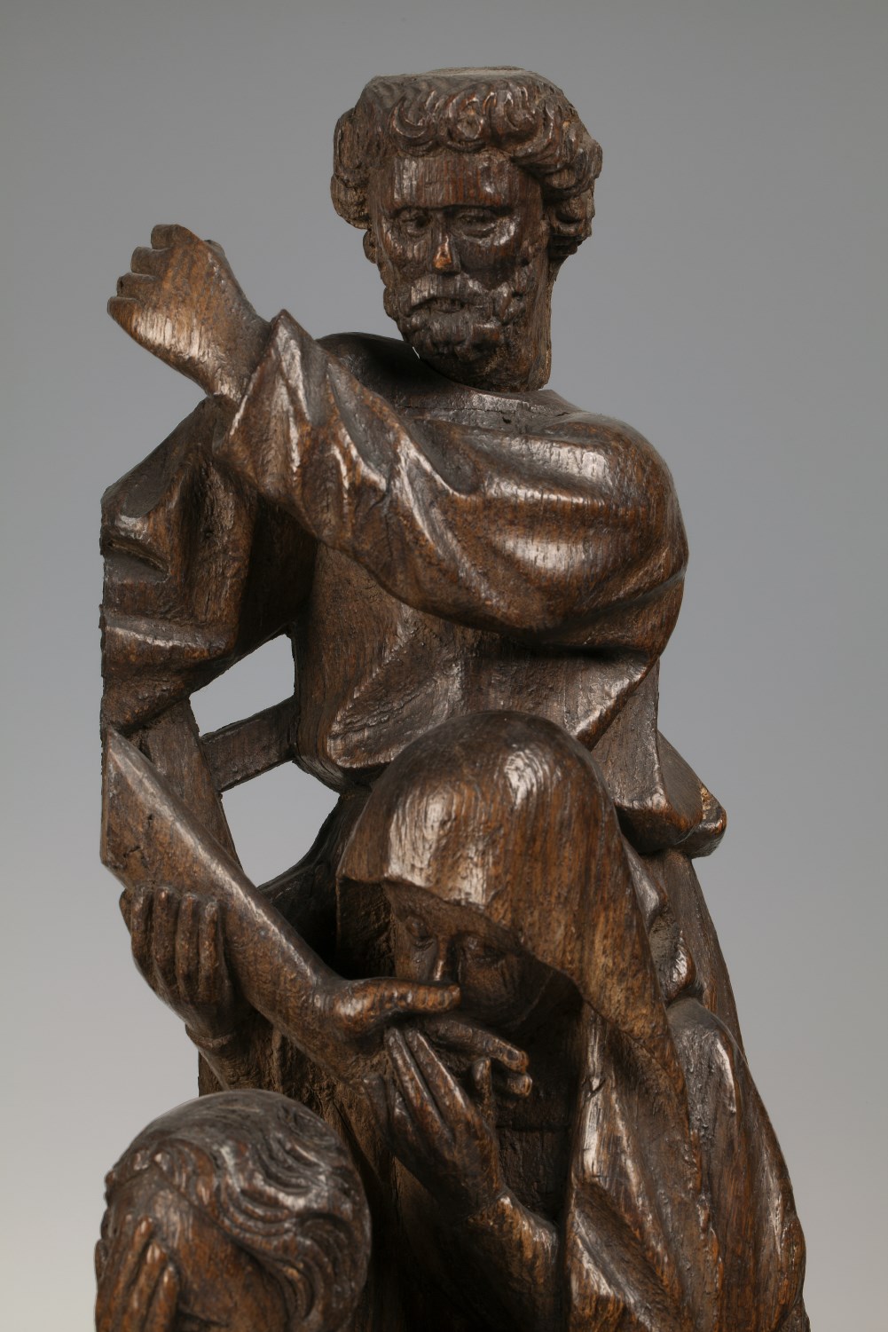 Het lichaam van Christus, dat van het kruis wordt genomen, wordt door twee mannen gedragen, van wie de linkerfiguur met muts als Jozef van Arimathea wordt gezien en de rechter, blootshoofds, als Nicodemus. Nicodemus staat op een nu deels verdwenen ladder waar hij zich met zijn linkerhand nog aan vasthoudt. Op de voorgrond vier vrouwen. ...