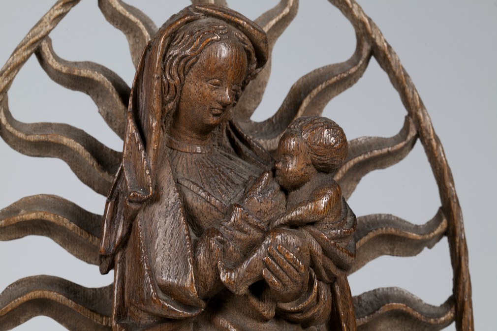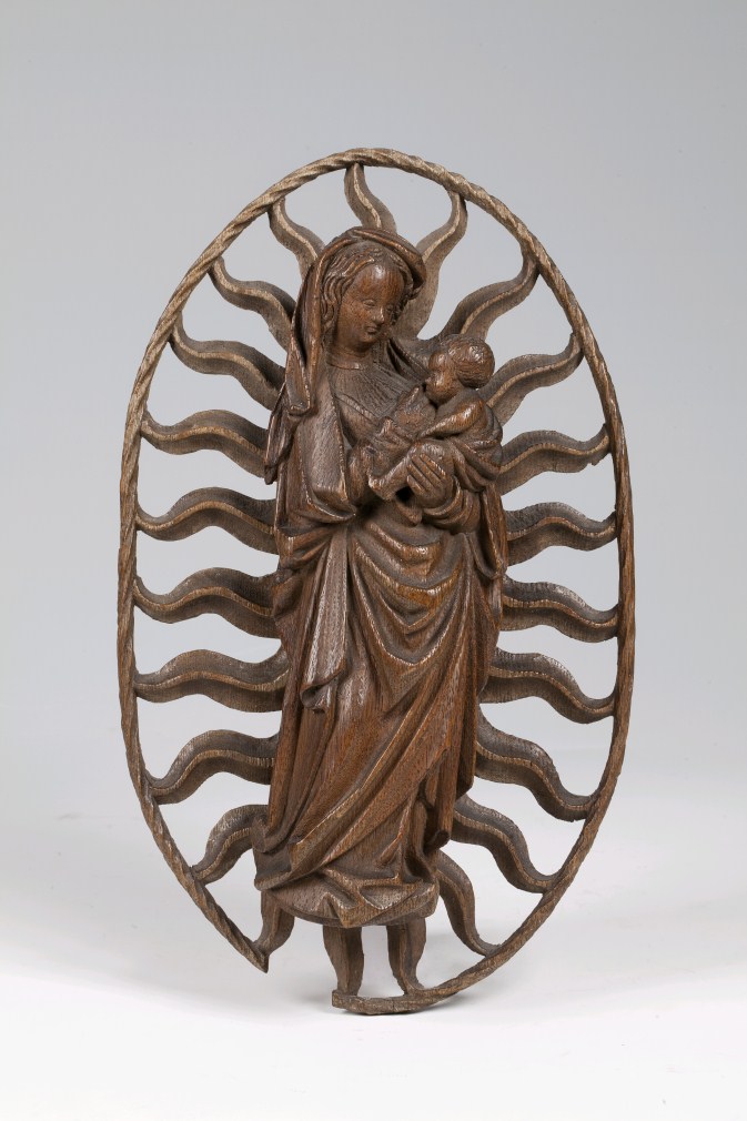 Maria staat driekwart naar rechts gewend op de maansikkel, rustend op haar linkerbeen. Ze is omgeven door een stralenkrans. De stralen zijn verbonden door een getorste band. Maria draagt het kind op haar linkerarm en biedt het met haar rechterhand de borst aan. Een slip van haar wijde mantel (?) heeft ze zorgzaam om het ...
