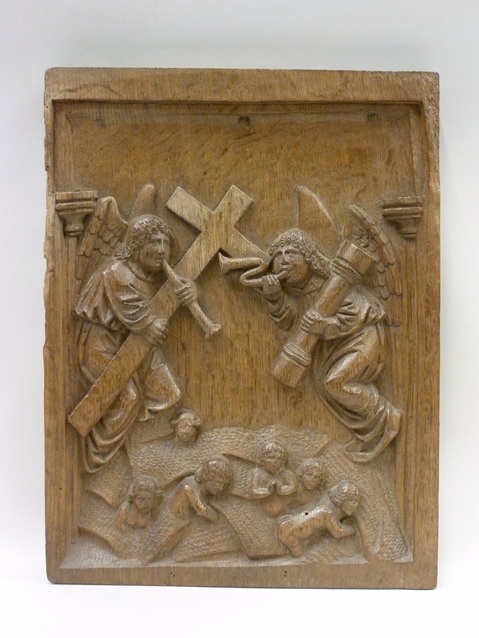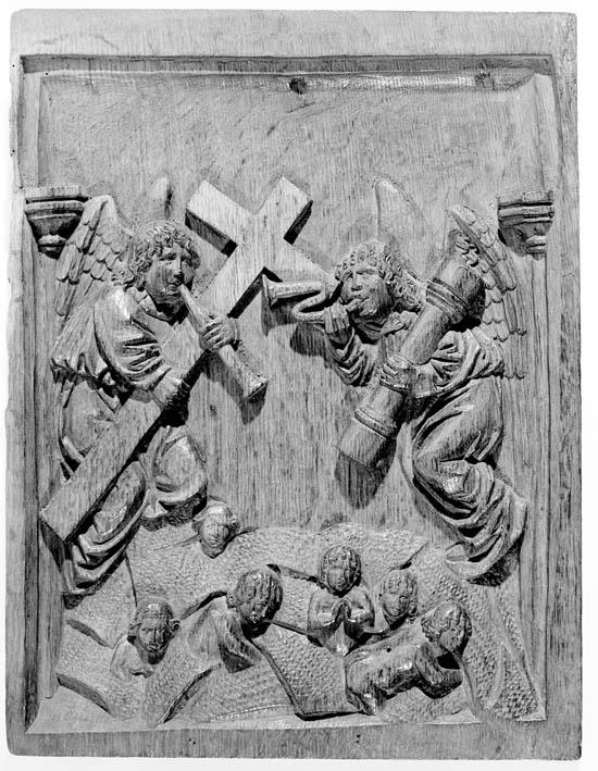 Boven een heuvelachtige grond zweven twee grote engelfiguren. De linker, driekwart naar rechts, draagt in zijn rechterhand een groot kruis dat hij schuin voor zich houdt en dat hij tevens met zijn linkerarm steunt. Hij blaast op een recht blaasinstrument dat hij in zijn andere hand houdt. De rechter draagt de geselkolom, die op zijn ...