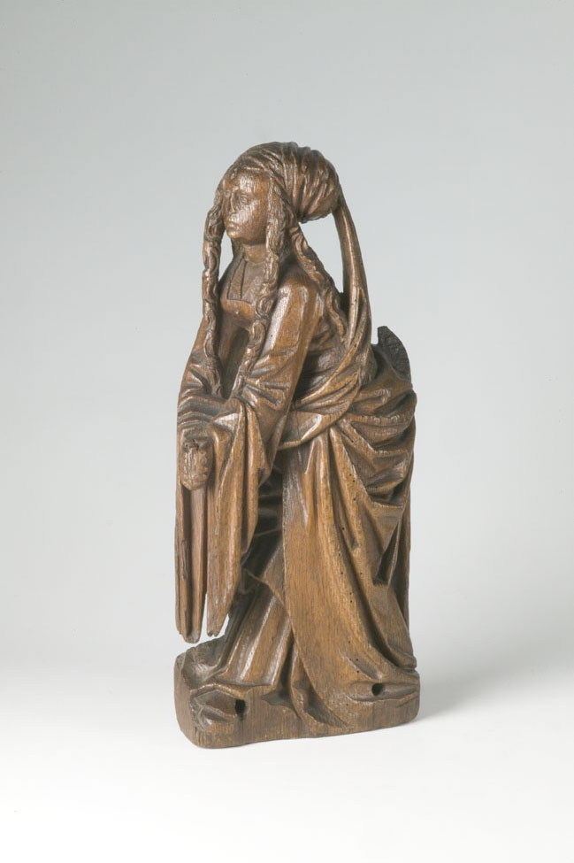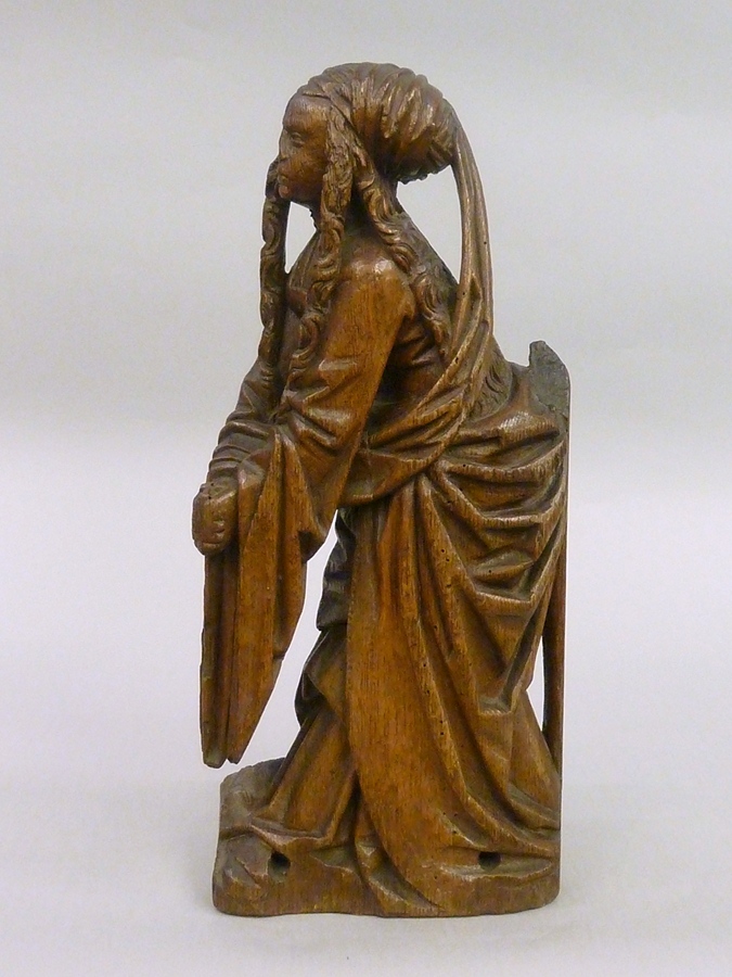 Maria Magdalena staat voorovergebogen en profil naar links en wringt haar handen. Achter haar een rechte lijst, aan de bovenzijde afgebroken. Zij is gekleed in een gewaad met vierkante halsuitsnijding, waarin een onderkleed met v-hals zichtbaar is. De rok van haar bovenkleed is aan de voorzijde opgeschort. Het bovenkleed heeft lange wijde mouwen. Om haar ...