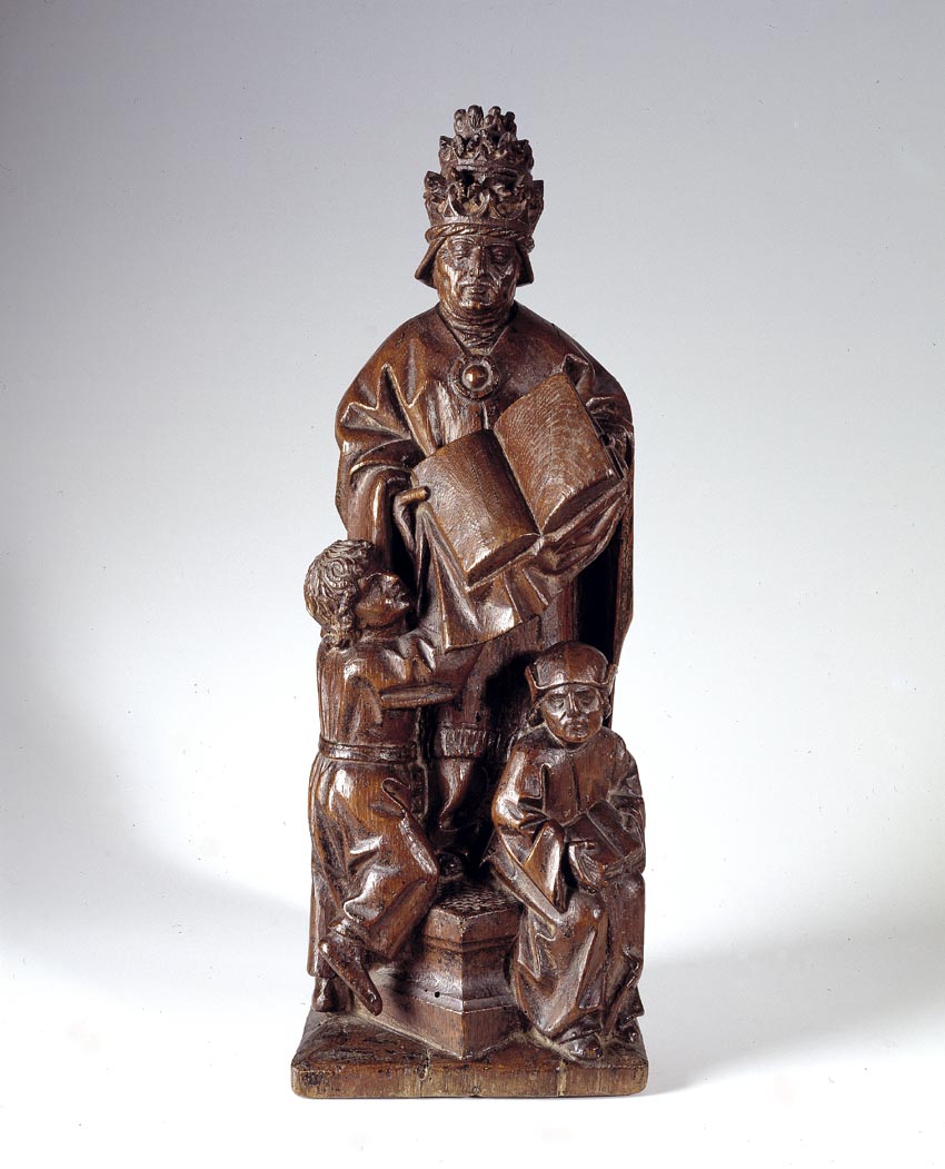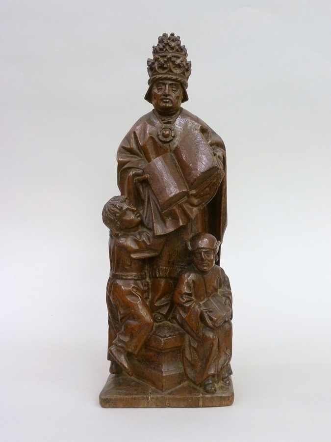 Gregorius de Grote is staande voorgesteld en draagt een open boek in beide handen. Hij staat op een overhoeks geplaatste, geprofileerde verhoging, waarvoor zich twee kleiner afgebeelde leerlingen bevinden. De linker heeft zich driekwart naar rechts gedraaid en helpt de paus het grote boek met afhangende boekband te dragen. Hij steunt met zijn rechterknie op ...