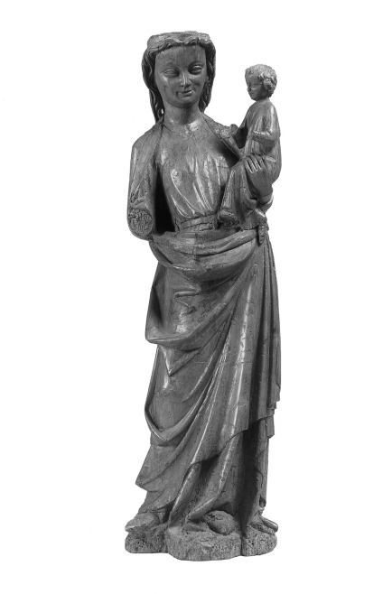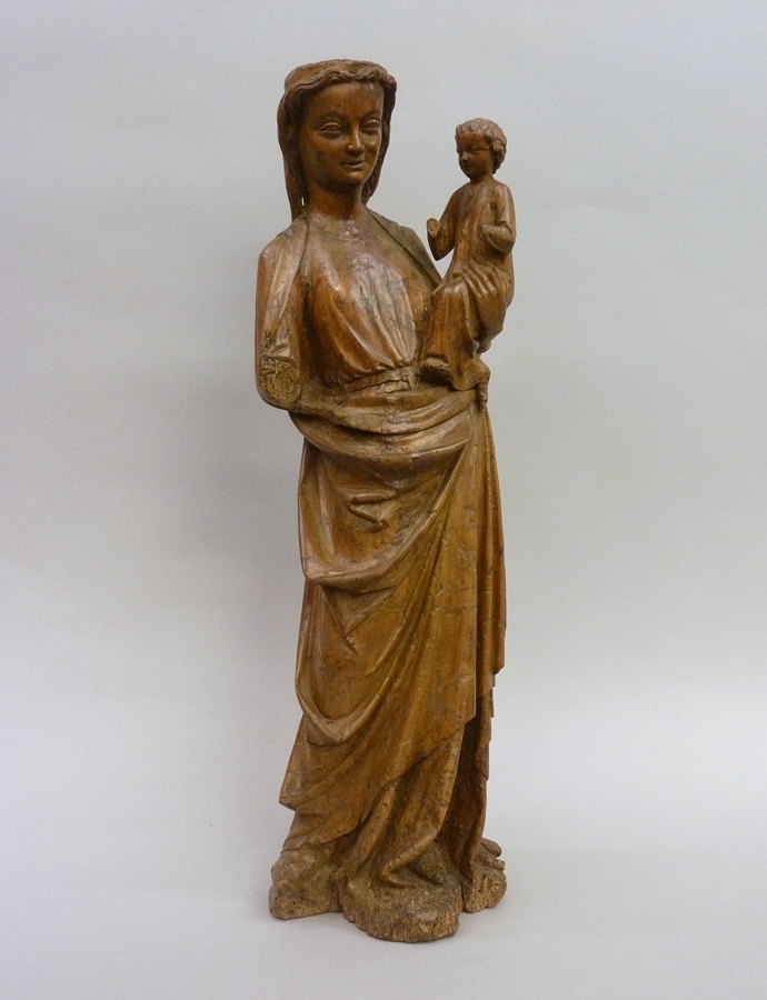 Maria is staande voorgesteld, rustend op haar linkerbeen. Zij draagt het Christuskind op haar linkerarm. Het kind zit rechtop naar links gewend en houdt beide armpjes halfgeheven. Maria staat op een kleine, vlakke grond. Maria draagt een lang, gegord gewaad met ronde halsuitsnijding. Een mantel ligt over haar beide schouders, is voor het lichaam langs ...