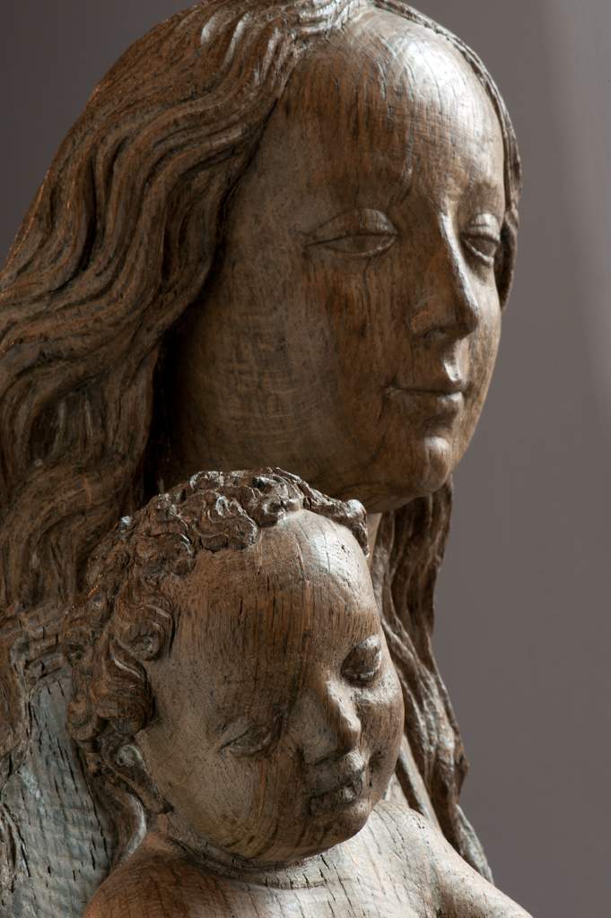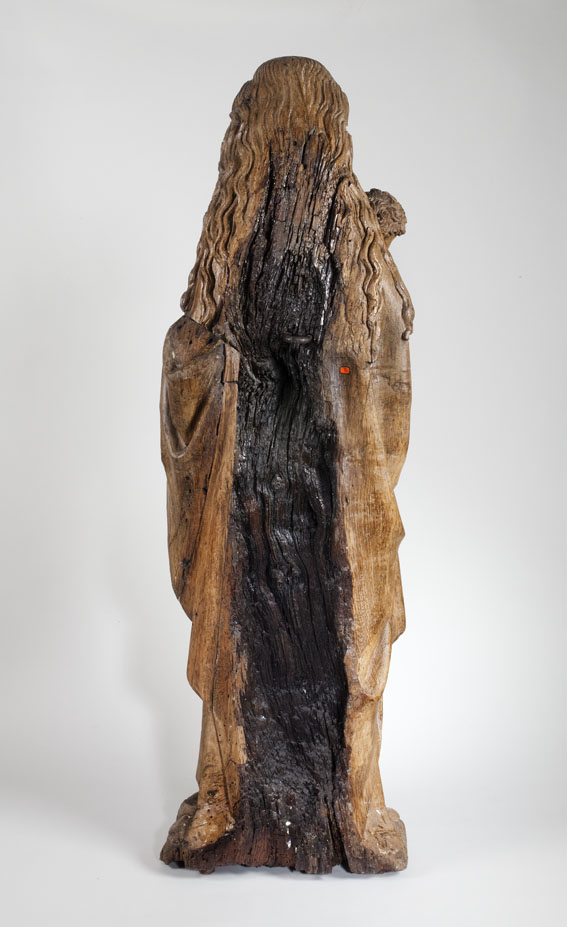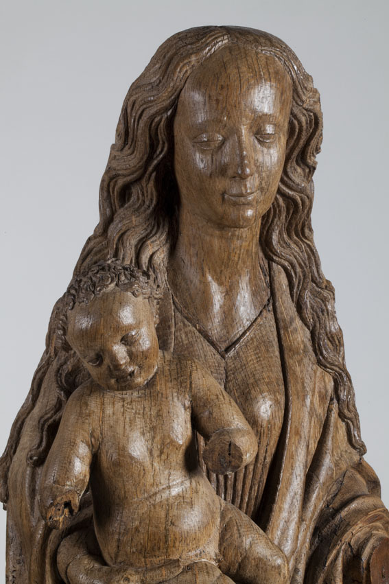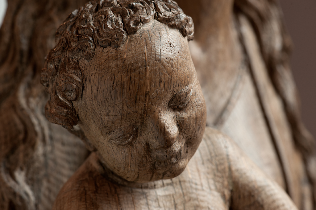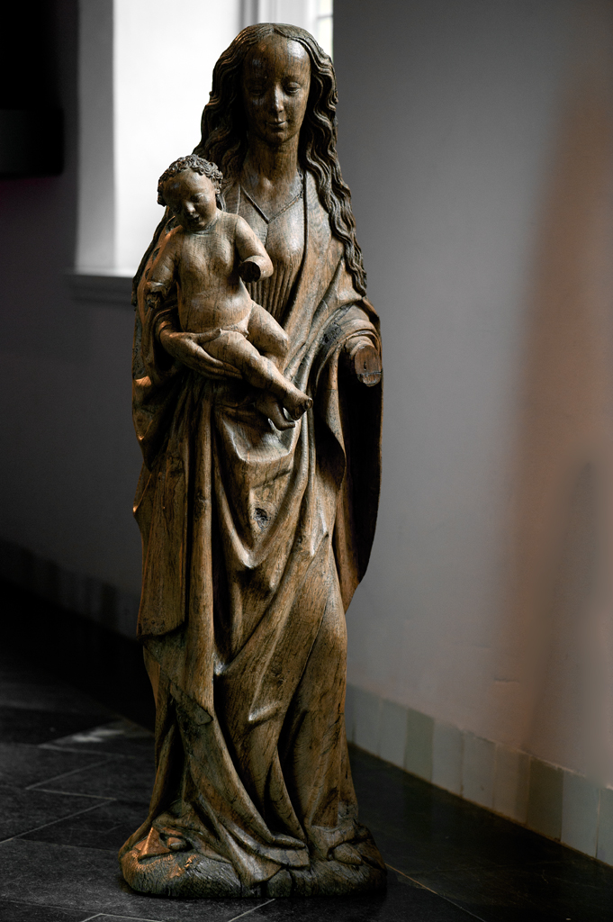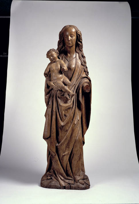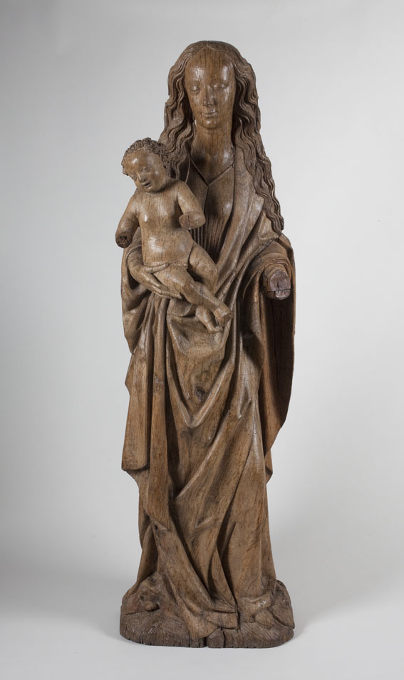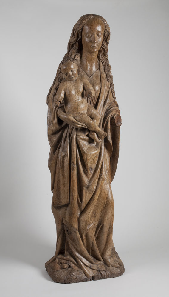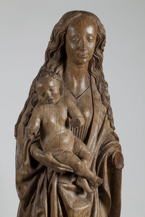 Maria is staande voorgesteld, rustend op haar rechterbeen. Haar hoofd is iets naar links geneigd. Zij drukt met haar rechterhand het naakte Christuskind tegen zich aan op haar uitgebogen heup. Het kind heeft zijn hoofdje naar links gewend en heeft zijn mondje geopend. Zijn beentjes zijn driekwart naar rechts gewend en over elkaar heengeslagen, het ...