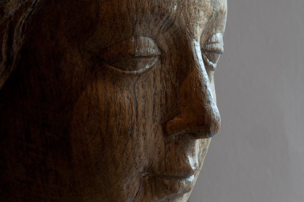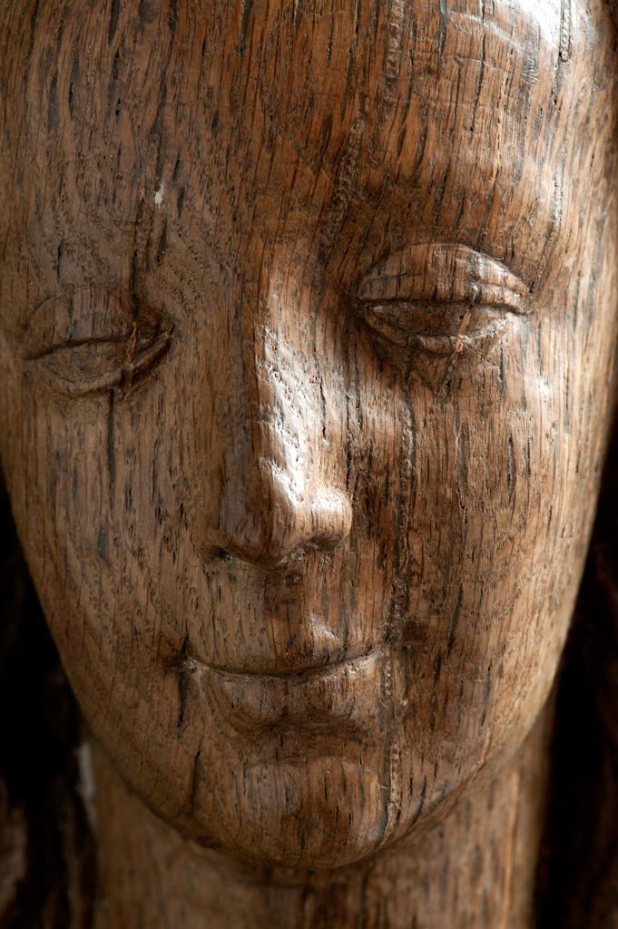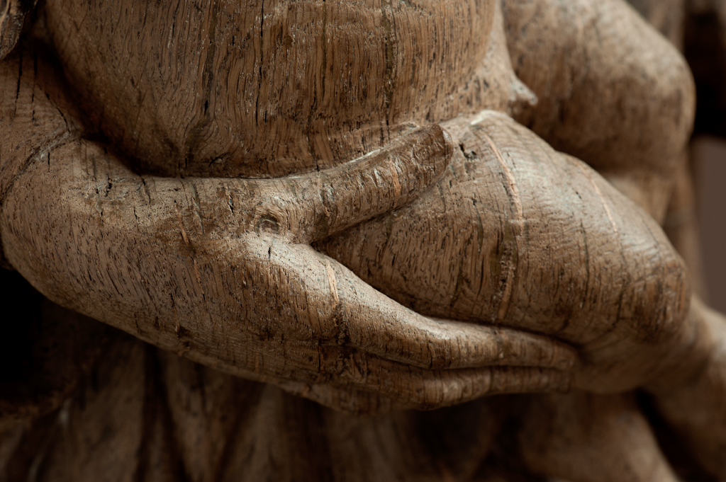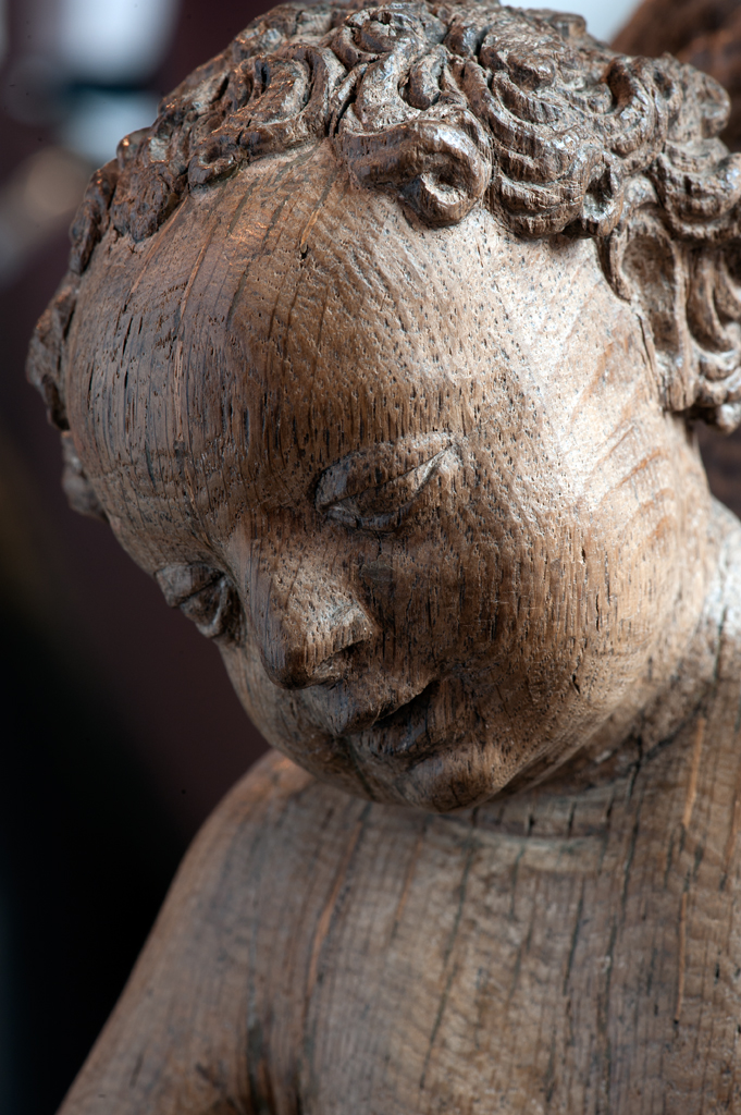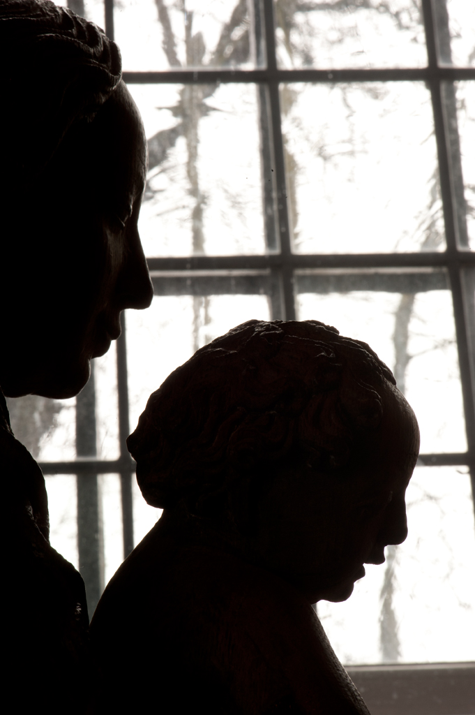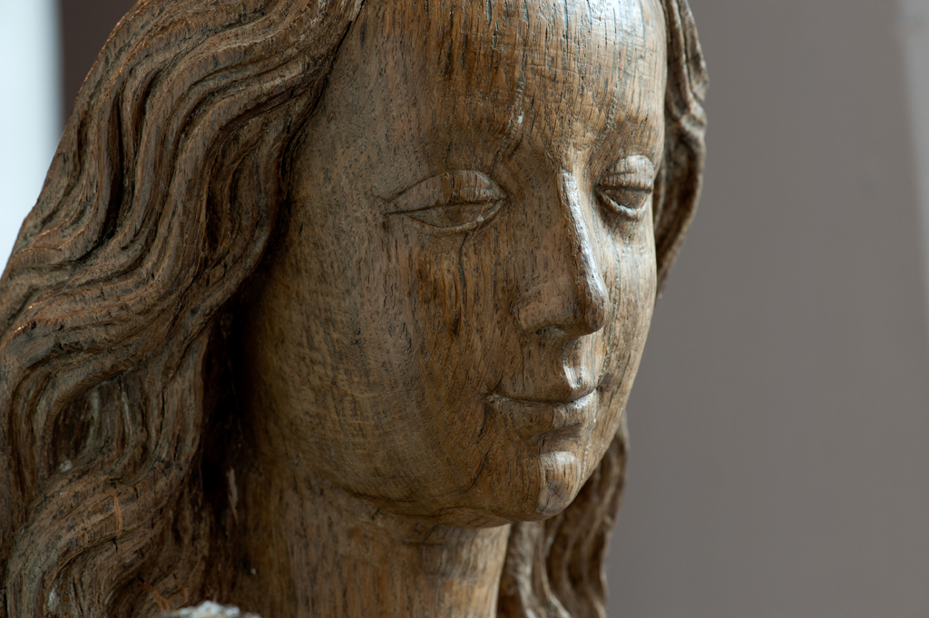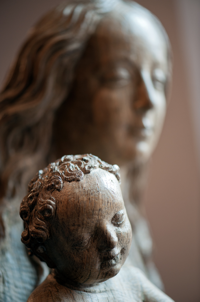 Maria is staande voorgesteld, rustend op haar rechterbeen. Haar hoofd is iets naar links geneigd. Zij drukt met haar rechterhand het naakte Christuskind tegen zich aan op haar uitgebogen heup. Het kind heeft zijn hoofdje naar links gewend en heeft zijn mondje geopend. Zijn beentjes zijn driekwart naar rechts gewend en over elkaar heengeslagen, het ...