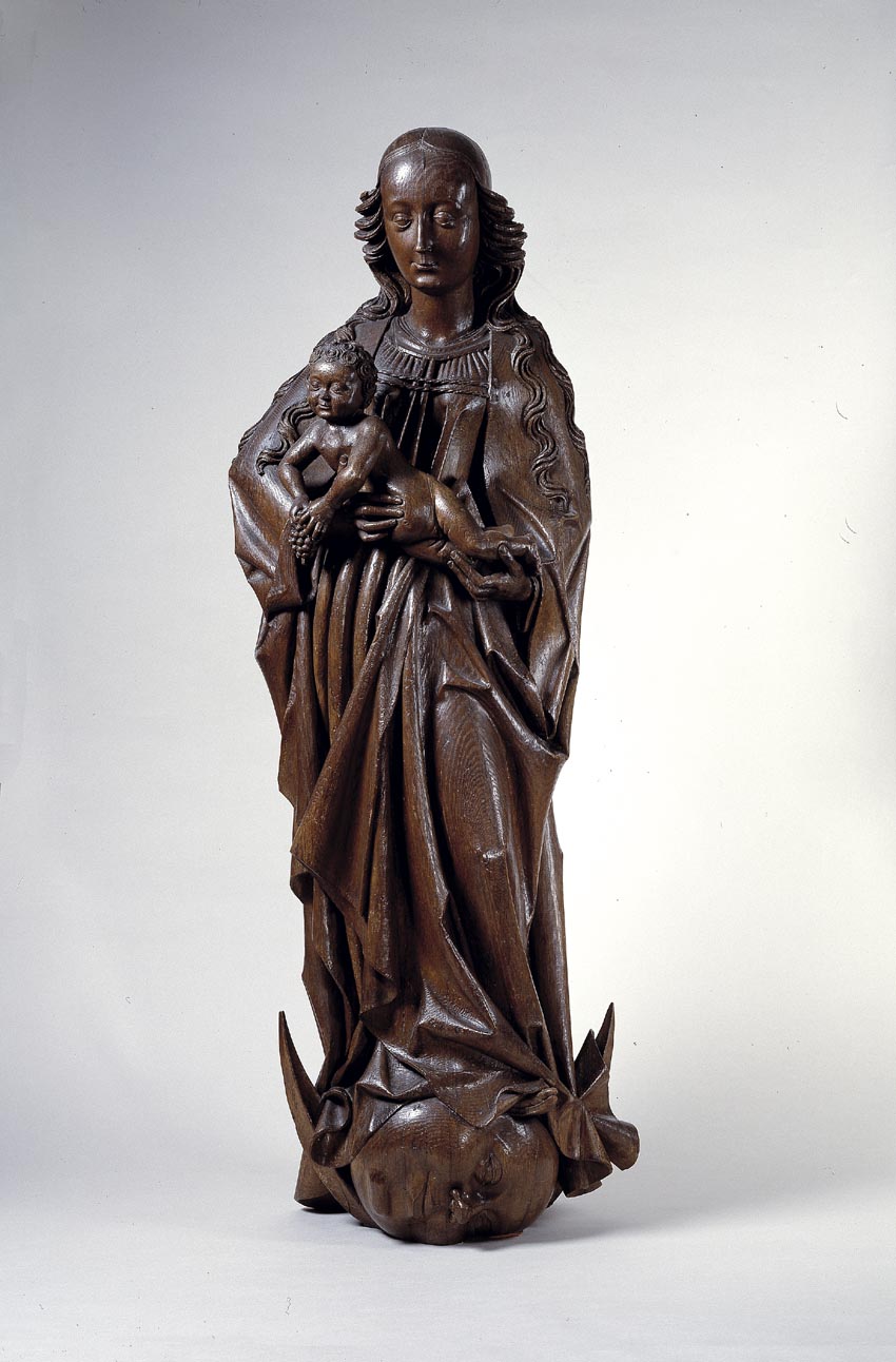 Maria is staande voorgesteld, rustend op haar rechterbeen. Haar vooruitgeschoven linkervoet heeft ze stevig op het bolle gezicht van de maan gezet, dat dwars, naar rechts, onder haar voeten ligt. Aan beide kanten ervan steekt een scherpe punt van de maansikkel omhoog. Maria draagt het naakte kind in beide handen voor zich en steunt het ...