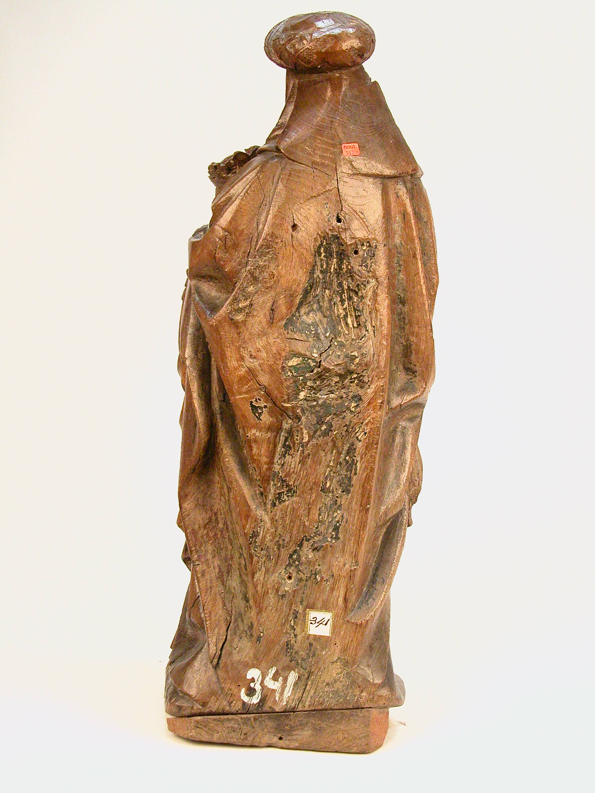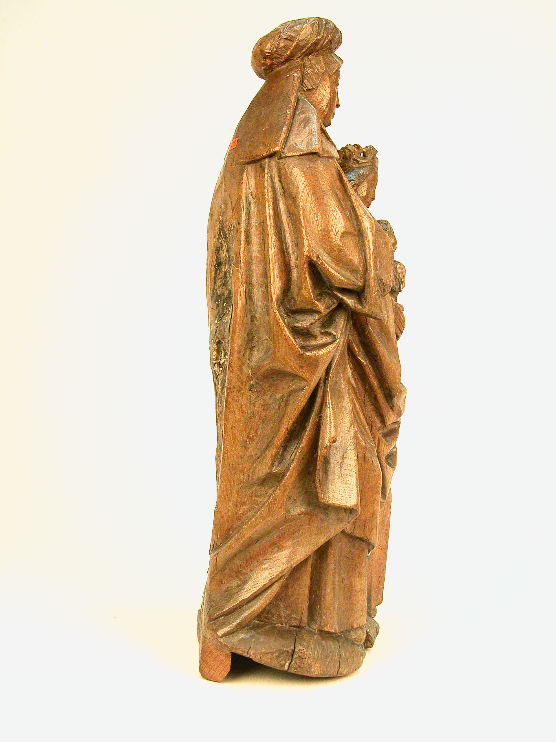 Anna staat half achter de eveneens staande, kleiner afgebeelde Mariam die het Christuskind op haar linkerarm draagt. Het kind grijpt met zijn rechterhand in Maria's haar. Anna heeft haar linkerhand op Maria's linkerschouder gelegd. De figuren staan op een afgeronde, met zigzaggroeven aangeduide grond. Anna draagt een hoofddoek, sluier en kindoek en daarop een tulband ...