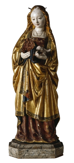 Maria is staande voorgesteld, rustend op haar rechterbeen. In haar beide handen draagt zij het nu vrijwel geheel verdwenen, halfliggende Christuskind. Zij draagt een kleed met vierkante halsuitsnijding, waarin een halsdoek en een hemd zichtbaar zijn. Om haar schouders ligt een mantel. De slippen ervan heeft zij beide onder haar rechterhand vastgezet, zodat de stof ...