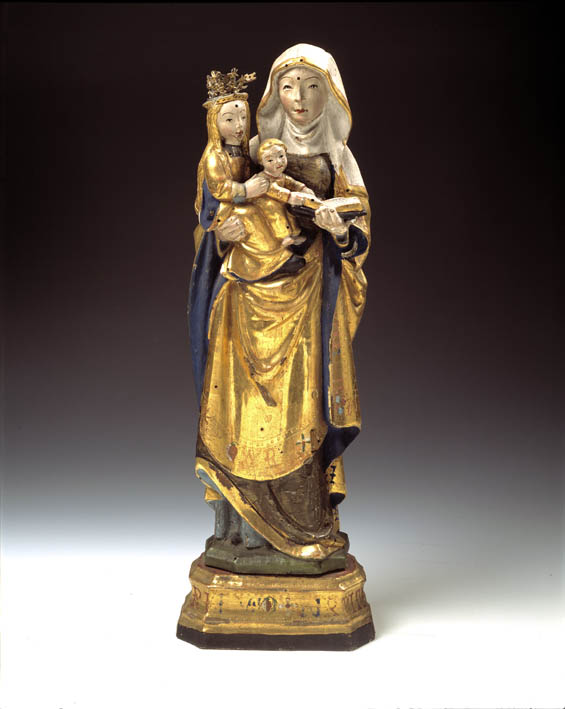 Anna is staande voorgesteld, rustend op haar rechterbeen. Op haar rechterarm draagt zij Maria, die met beide handen het Christuskind vasthoudt. Het kind grijpt met zijn handjes naar het opengeslagen boek in Anna's linkerhand, terwijl hij naar de toeschouwer kijkt. Anna draagt onder- en bovenkleed, mantel met versierde rand en hoofd- en kindoek. Maria draagt ...