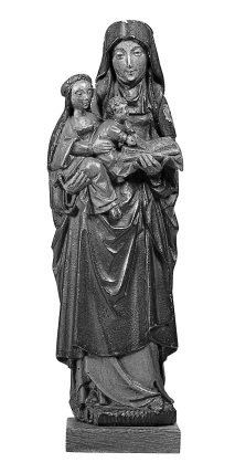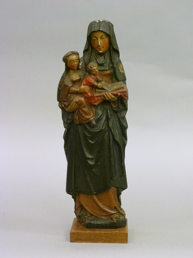 Anna is staande afgebeeld, rustend op haar rechterbeen. Op haar rechterarm draagt zij Maria, die op haar beurt het Christuskind op haar schoot houdt. Het kind bladert in het boek dat Anna in haar linkerhand heeft. Anna staat op een kleine, met zigzaggroeven afgewerkte grond, die op zijn beurt op een rechthoekig sokkeltje rust. Anna ...