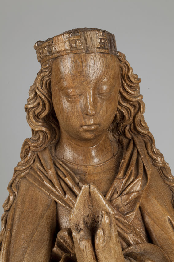 Cunera is staande voorgesteld met gevouwen handen. Zij heeft haar rechtervoet naar voren geplaatst. Zij staat op een met fijne groefjes aangeduide grond en met haar rechtervoet op een slip van haar mantel. De heilige is gekleed in een ruim gewaad, dat zij aan de voorzijde onder haar linkerarm heeft opgenomen zodat het over de ...