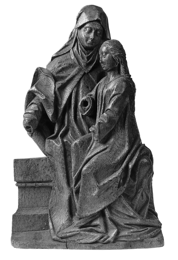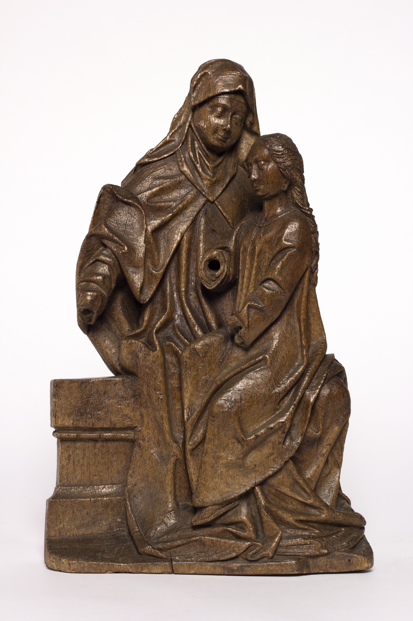 Anna zit iets naar rechts gewend op een geprofileerde bank. Ze draagt de kleinere Maria op haar linkerknie. Anna heeft haar rechterarm naar links uitgestoken. Maria heeft haar linkerarm naar beneden uitgestrekt, de rechter houdt ze half gebogen voor zich. Anna rust met haar voeten op een klein grondje. Anna draagt een lang gewaad en ...